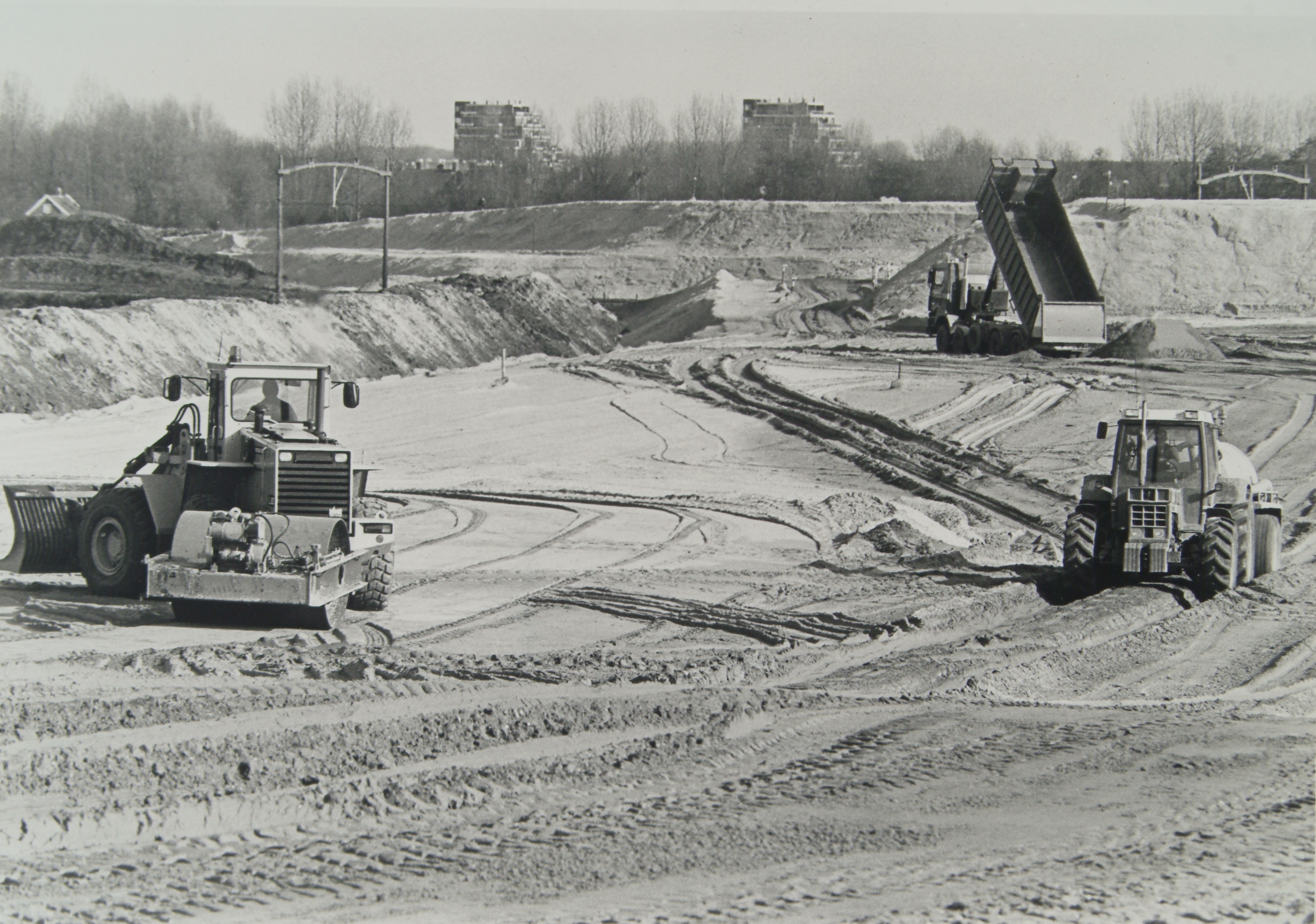 - flatgebouwen graafmachines vrachtwagens wegenbouw