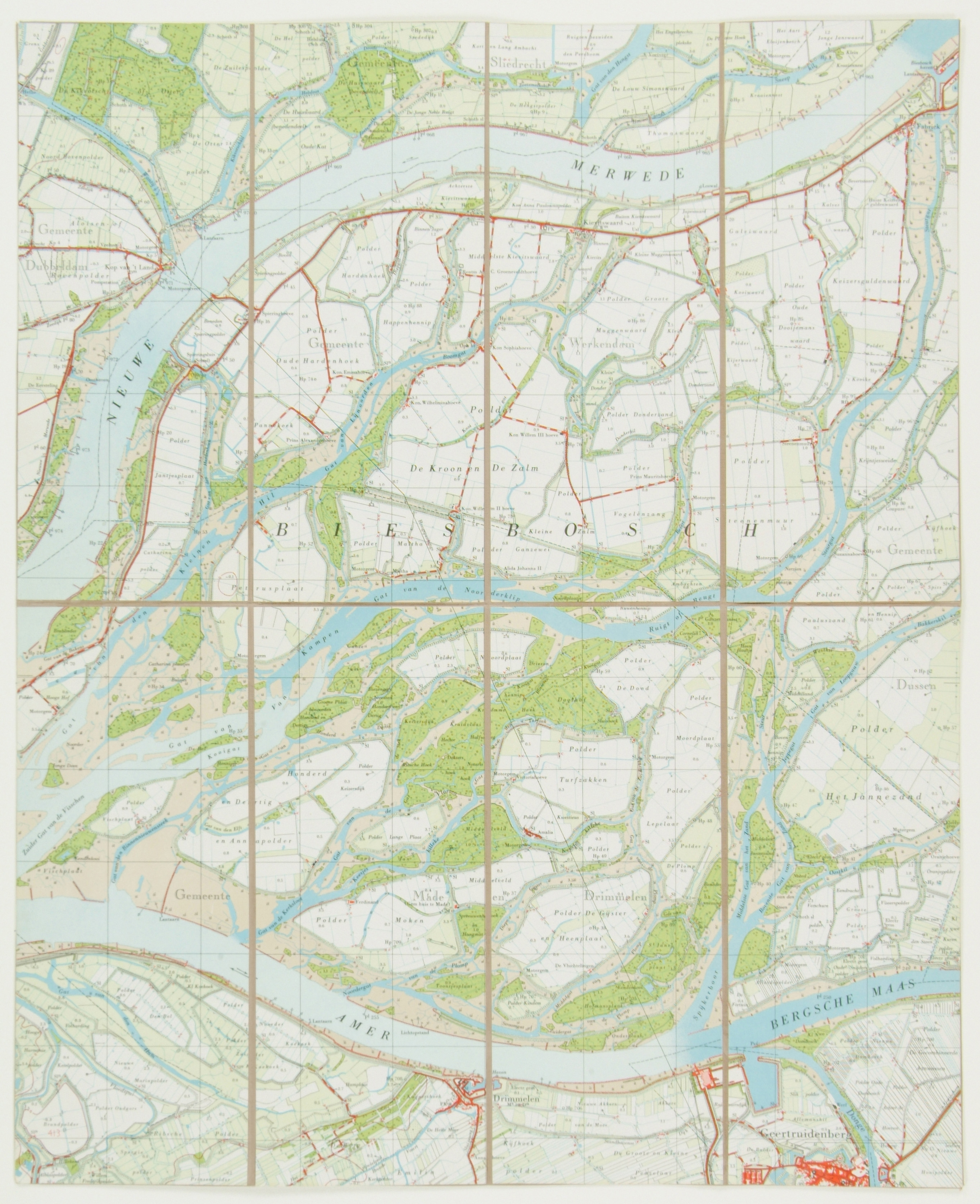 Topografische kaart Biesbosch, rechtsboven Steurgat, rechtsonder Geertruidenberg, linksonder Alblaspolder, linksboven Wantij.