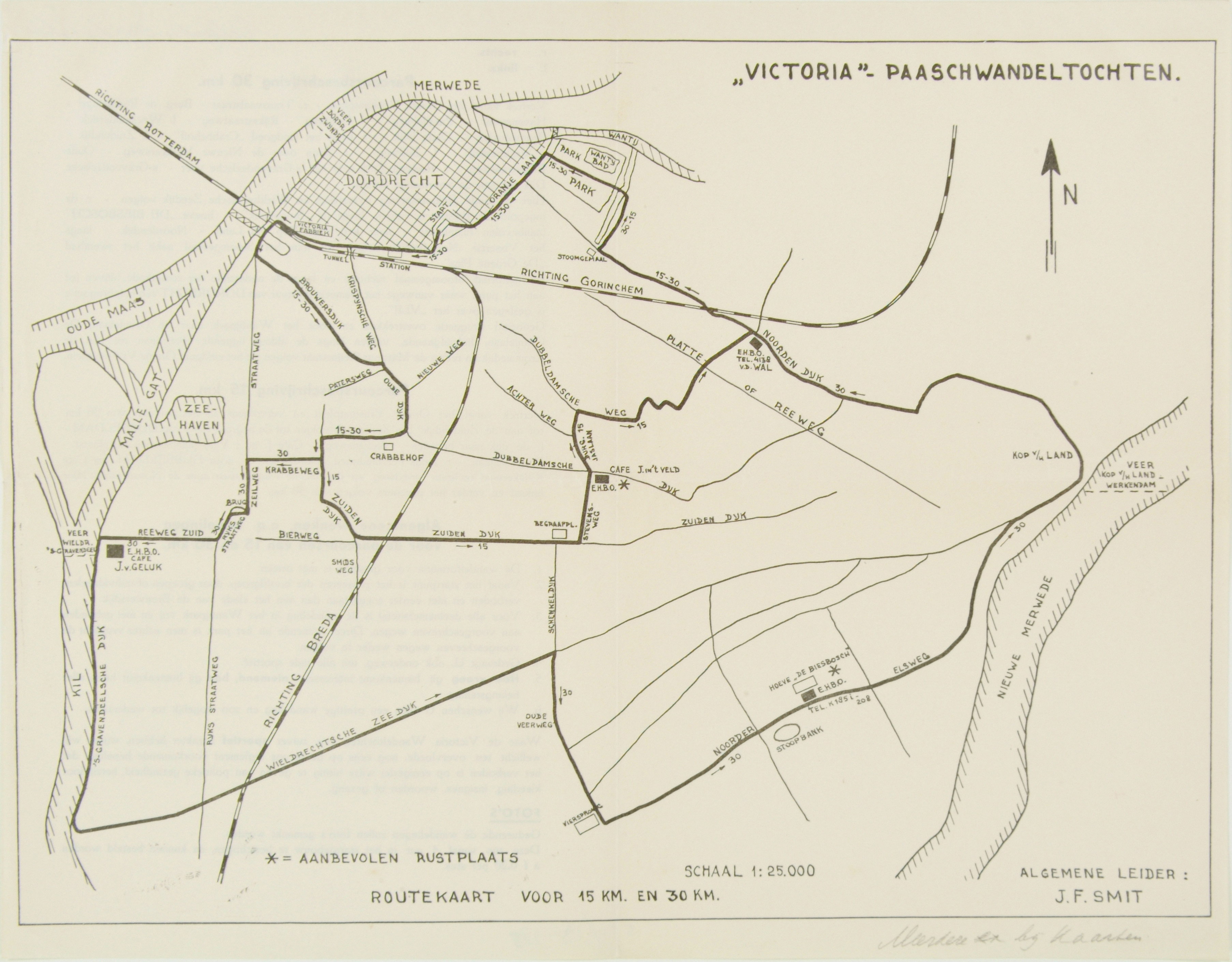 Routekaart van de Victoria paaswandeltochten op het Eiland van Dordrecht.