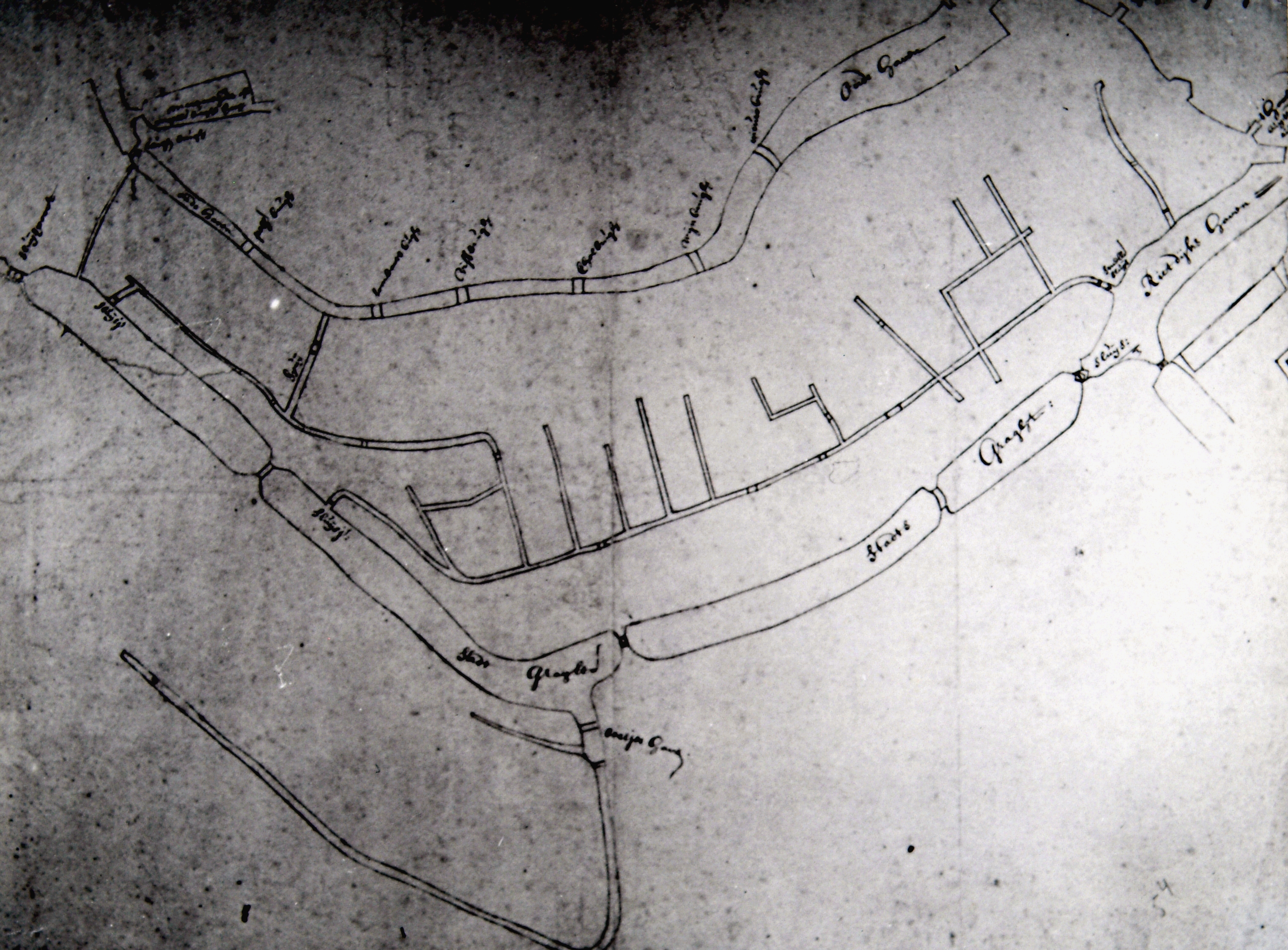 Grondtekening van de wateren door de stad Dordrecht (pentekening zonder datum 42,5x54 cm).