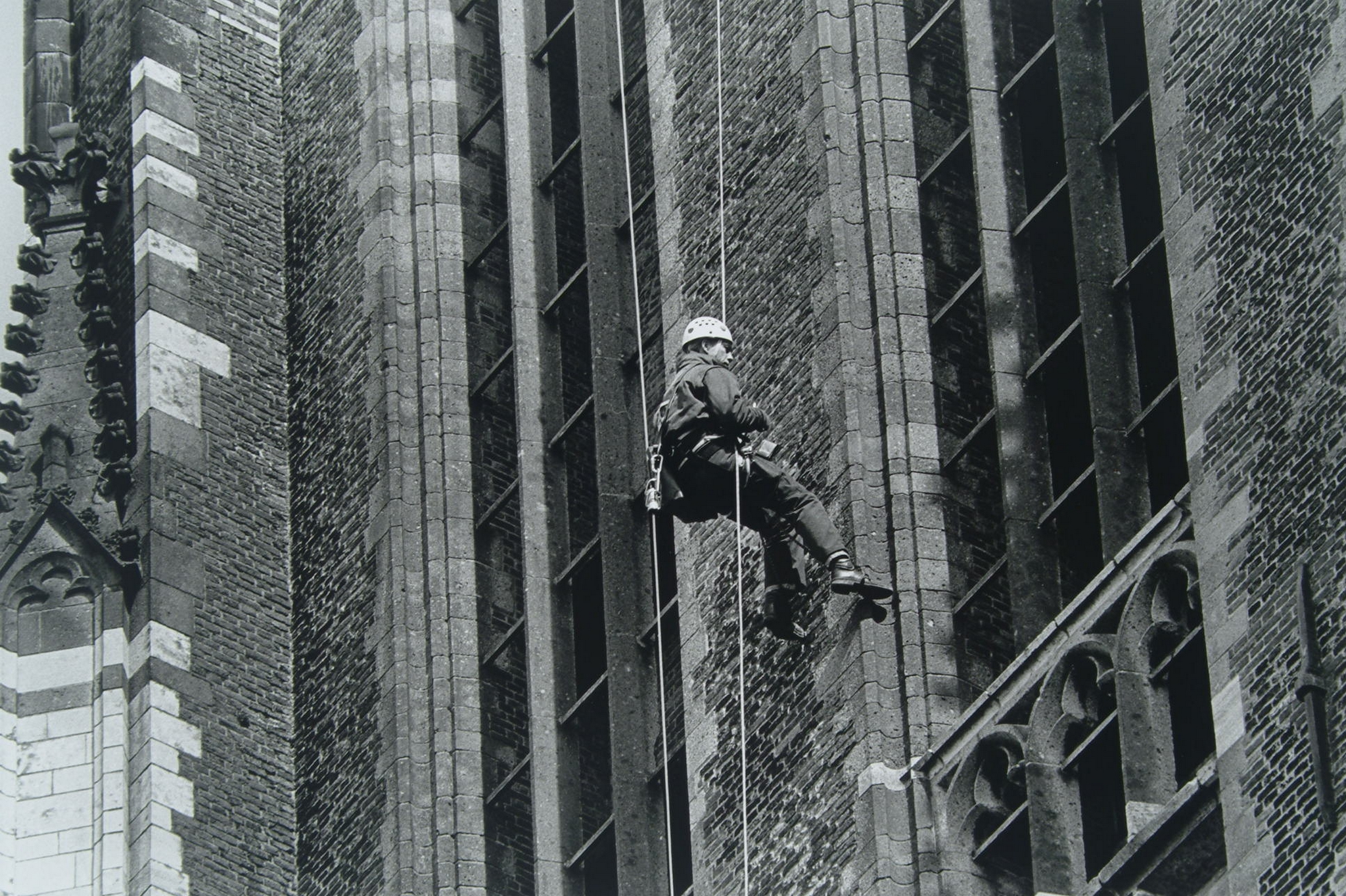 - Man aan touw inspecteert het voegwerk van de Grotekerkstoren