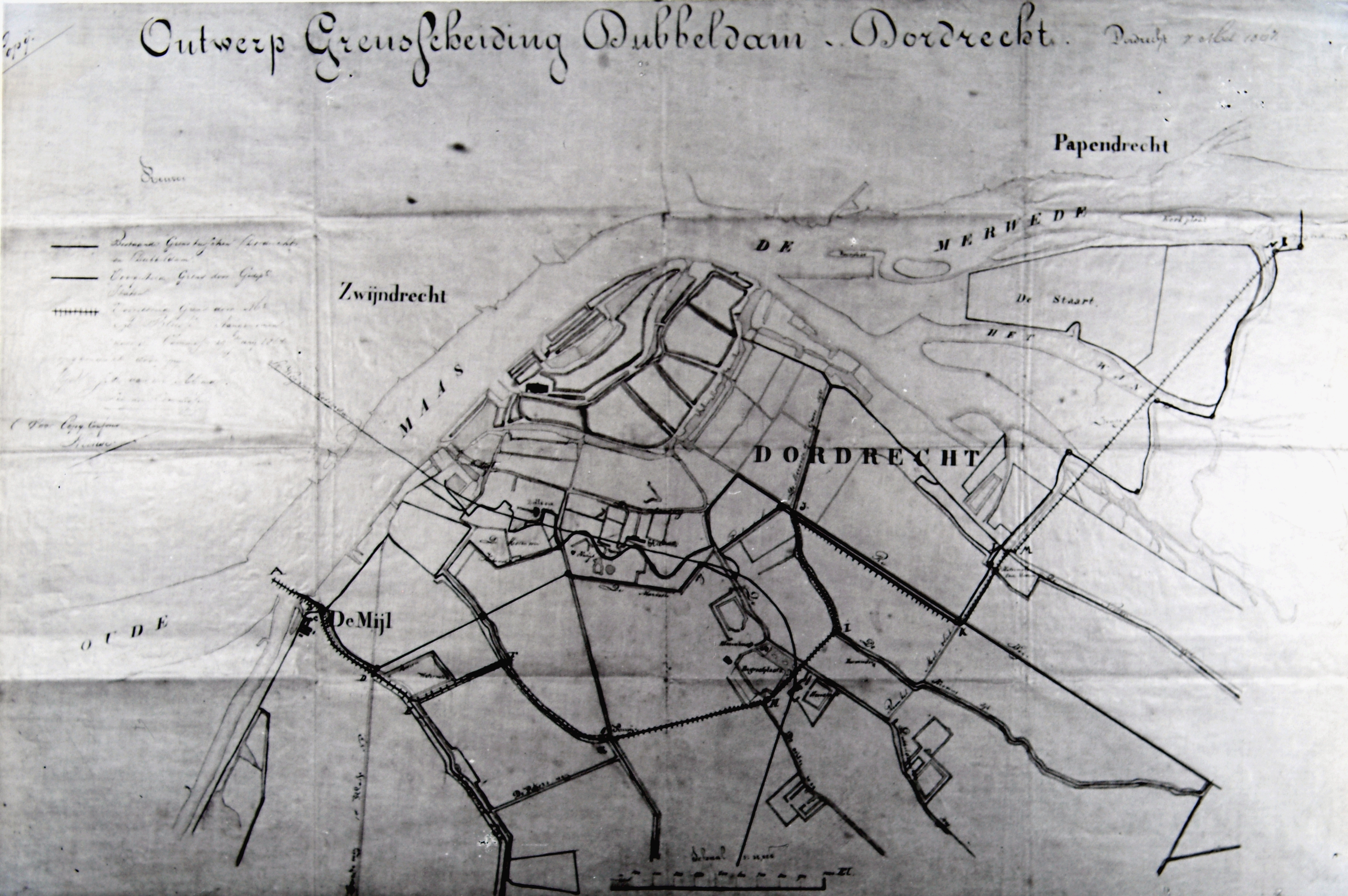Ontwerp grensscheiding Dordrecht-Dubbeldam. Tekening in kleur.