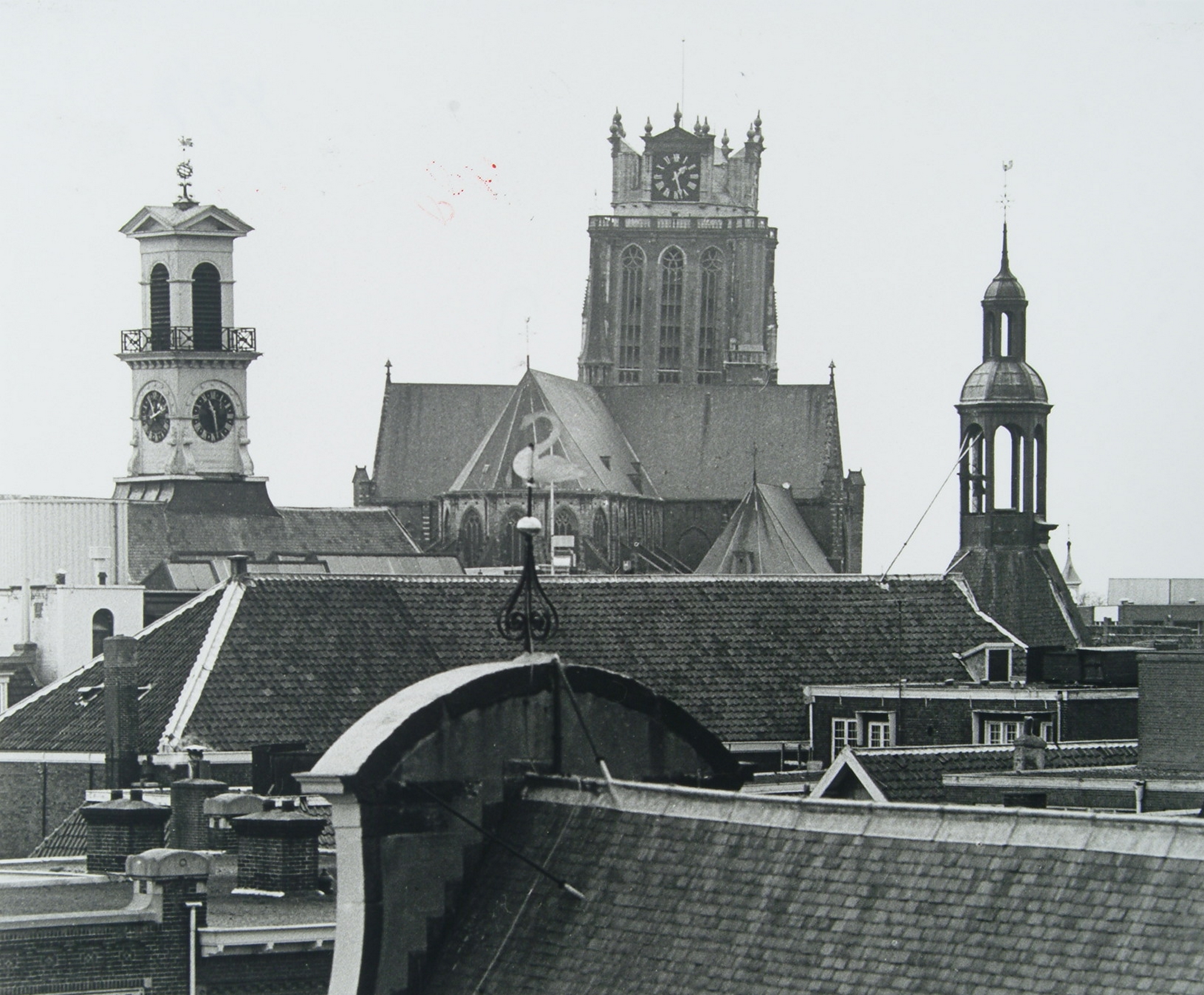 - Gezicht vanaf hoogbouw aan het Statenplein op de Stadhuistoren, de Grote Kerk, de oren van de Waalse kerk, het torentje van de Sint Jacobskapel, op de voorgrond de achterkant van de voorgevel van de Lutherse kerk aan de Vriesestraat