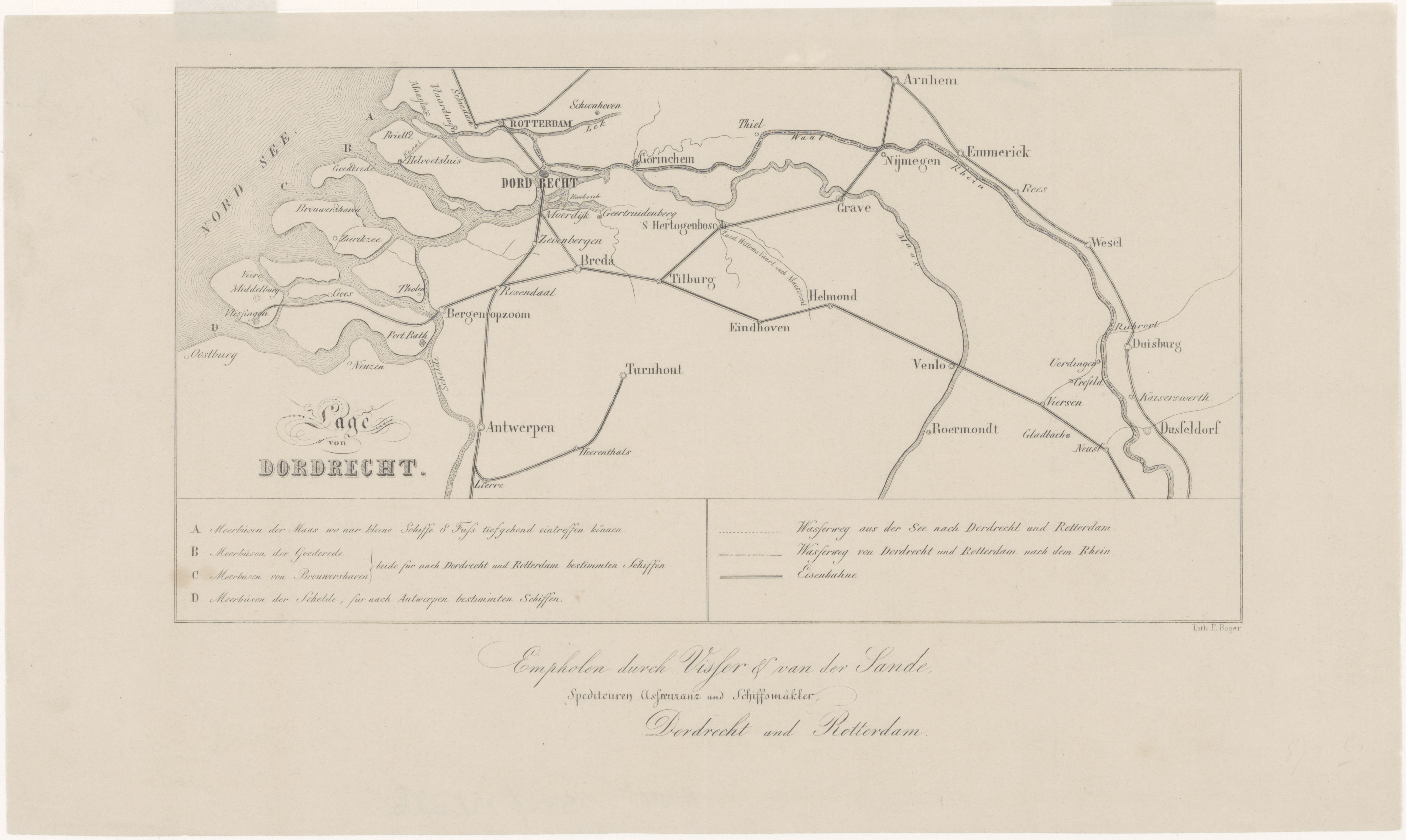 - Kaartje van het gebied tussen Düsseldorf, Arnhem, Rotterdam, en Vlissingen. De nadruk ligt op de water- en spoorwegen. Legenda langs onderrand.