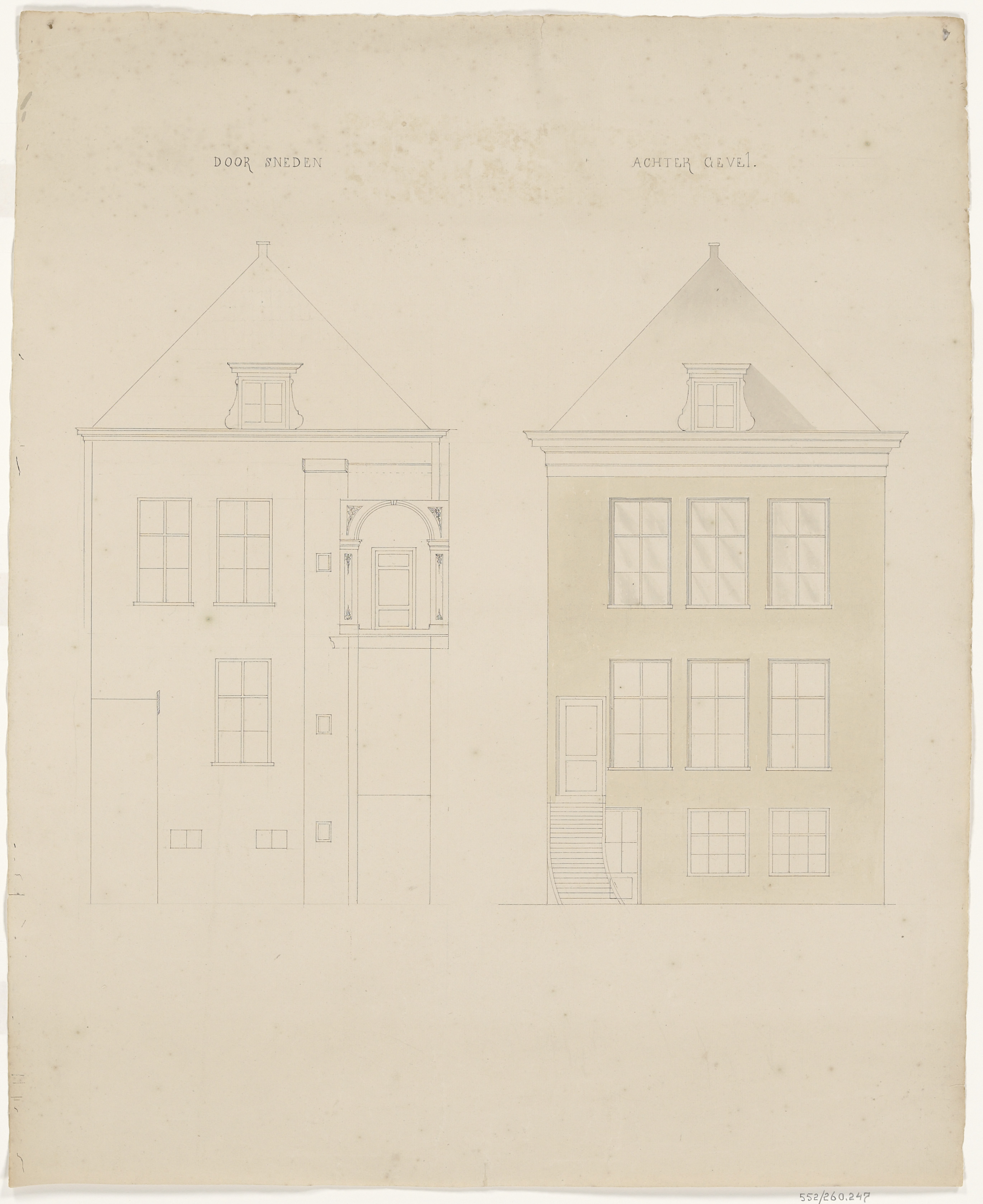 De doorsnede en achtergevel van een woonhuis. De achtergevel met een trap naar de deur …
