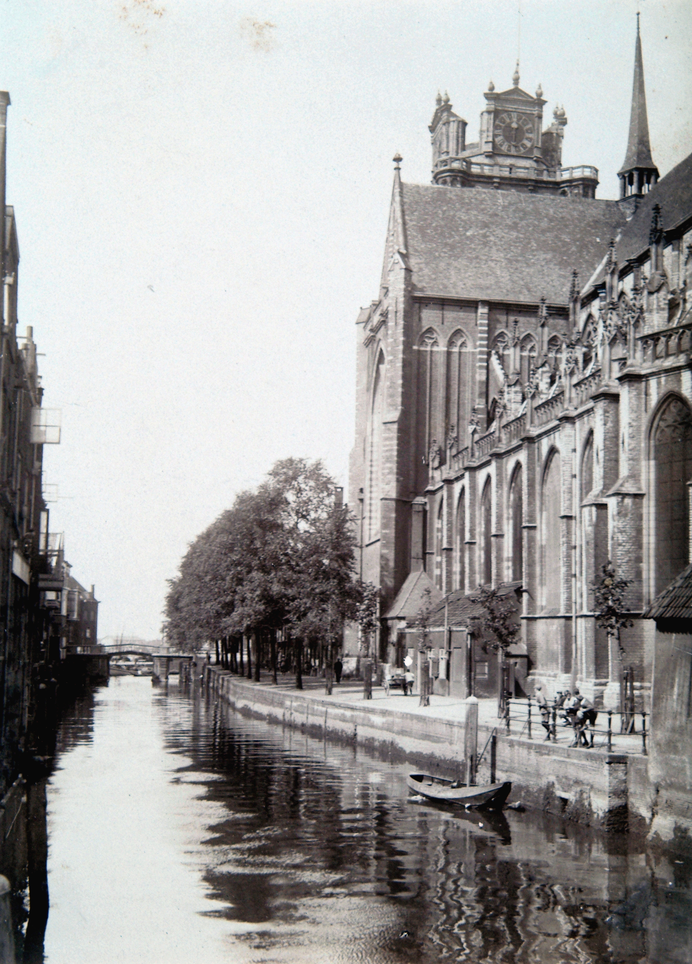 - De Voorstraatshaven vanaf de Pelserbrug in de richting van de oude Leuvebrug. Links de achterkant van panden aan de Voorstraat, rechts de Pottenkade met de Grote Kerk.