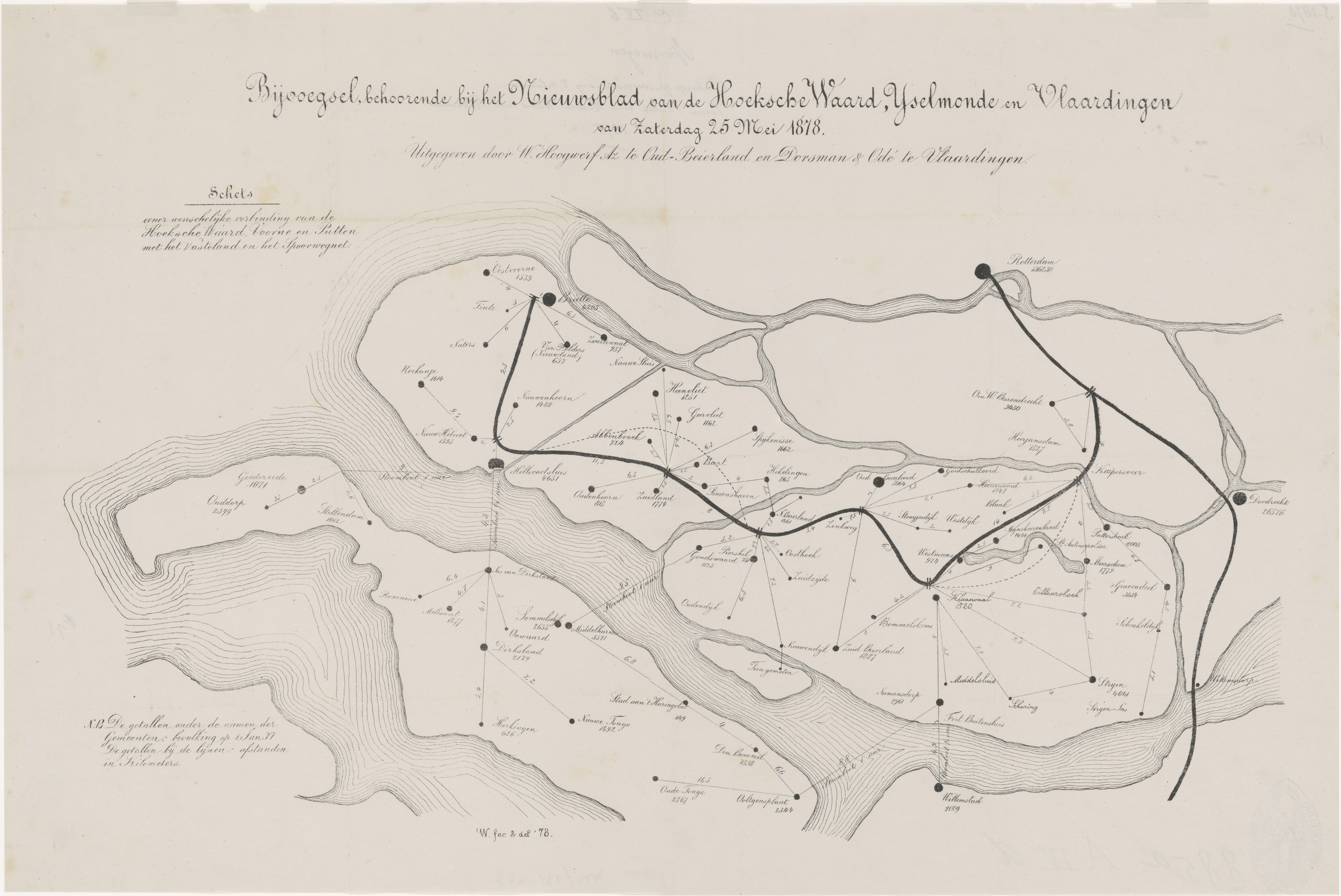 - Kaart van Voorne-Putten, de Hoeksche Waard en Goeree-Overflakkee met daarop het ontwerp van een spoorwegverbinding Brielle-Hellevoetsluis- Piershil-Westmaas-Barendrecht. Tevens ook met aanduiding van bevolkingsaantallen en afstanden.
