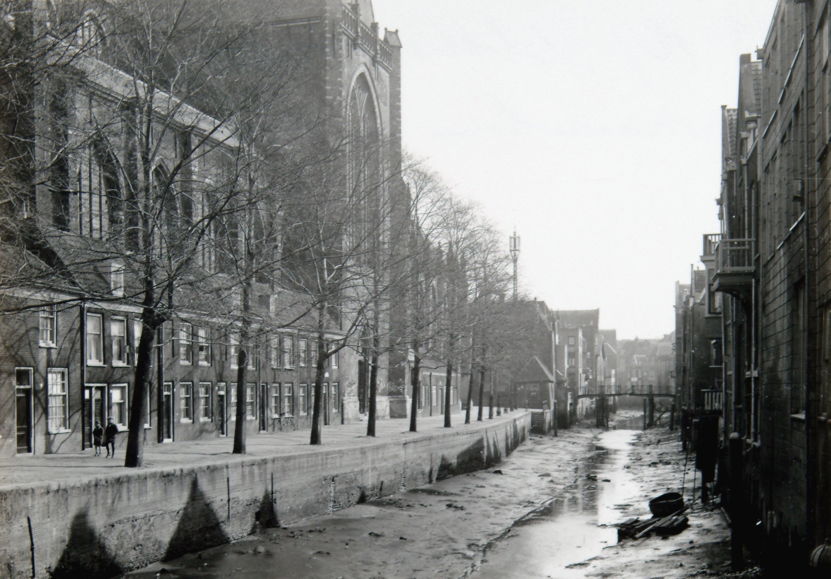 - Bijna drooggevallen Voorstraatshaven vanaf de Leuvebrug richting Pelserbrug. Links de Pottenkade met Grote Kerk. rechts achtergevels van panden aan de Voorstraat.