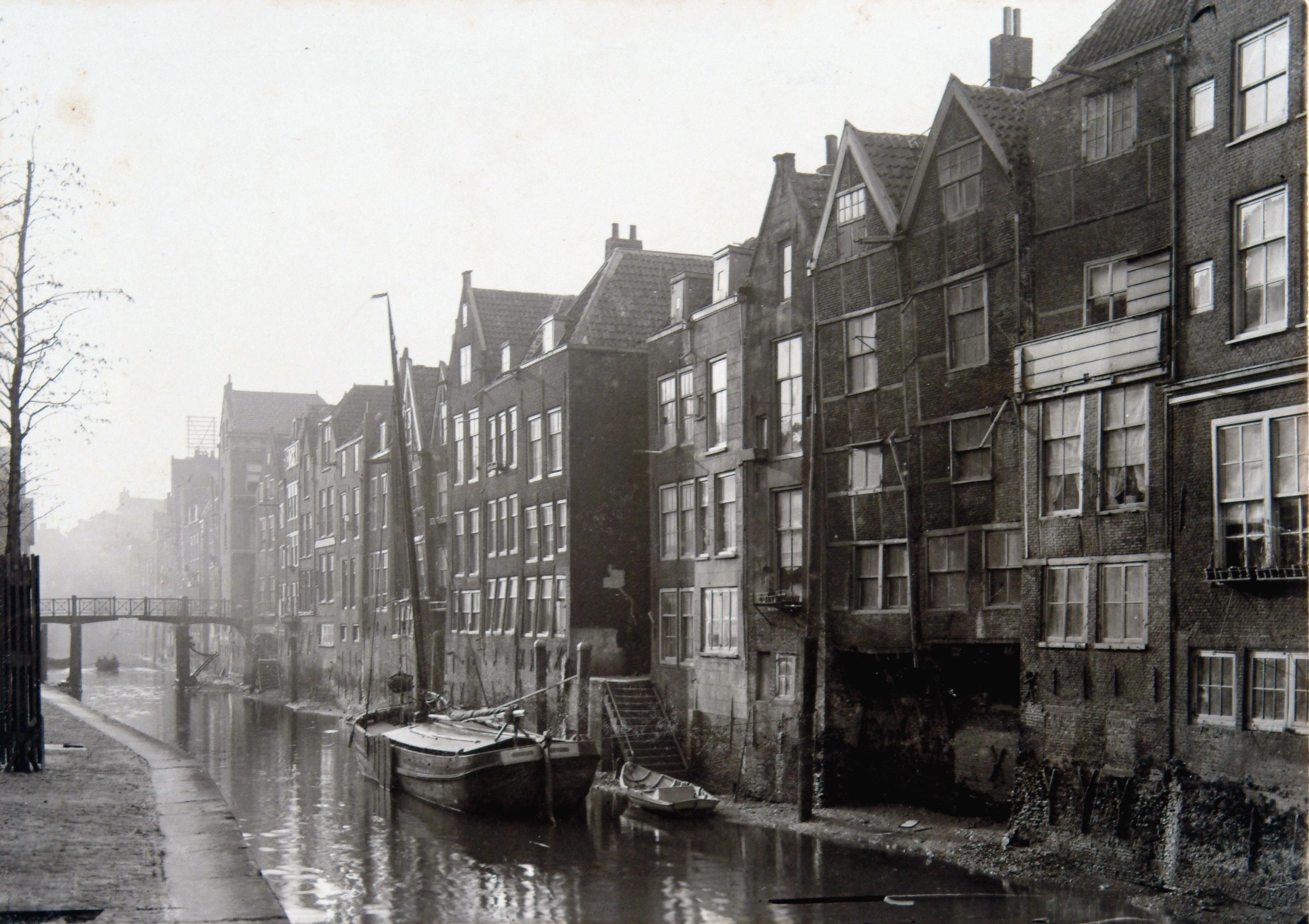 De Voorstraatshaven vanaf de Pottenkade in de richting van de Pelserbrug. De achtergevels zijn van panden aan de Voorstraat. De vrachtboot ligt bij de Ruitensteiger.