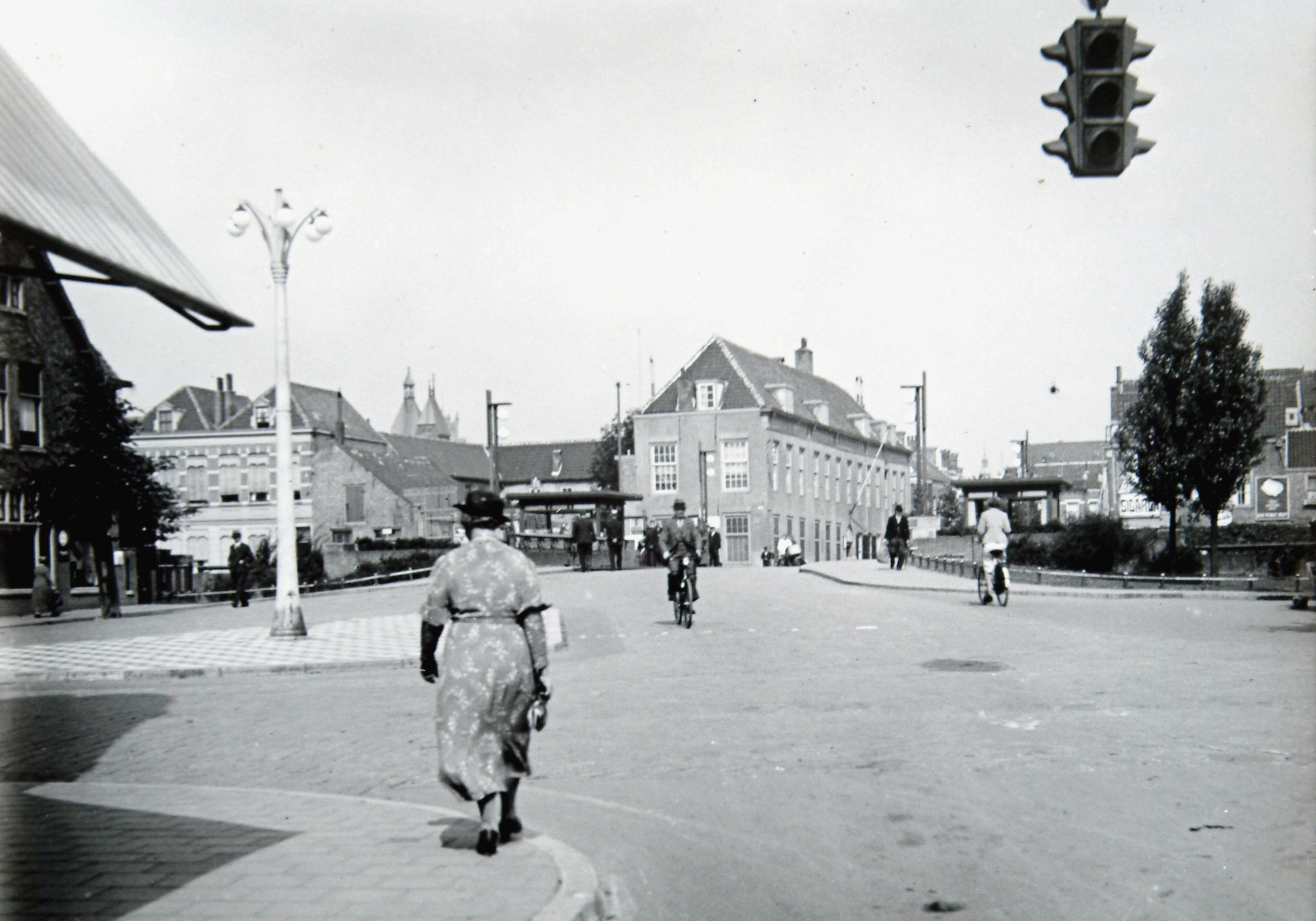 - De Vriesebrug vanaf het Vrieseplein in de richting van de Vriesestraat en de Vest. Het gebouw in het midden is het militair hospitaal. De torentjes links daarvan zijn van het postkantoor op het Bagijnhof. De huizen achter de lantaarnpaal staan aan de Vest.