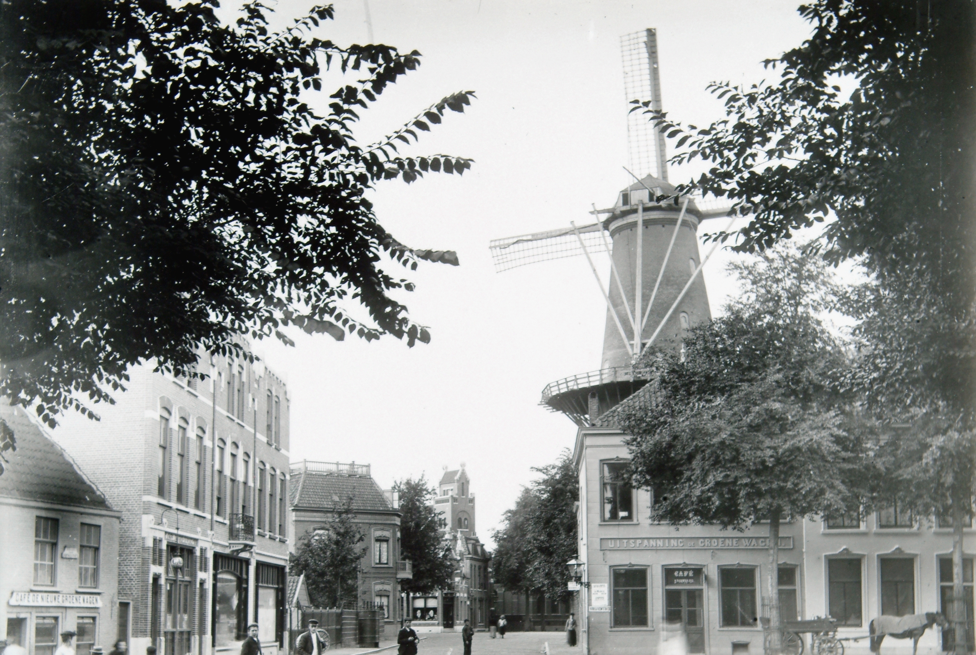 - Stukje Vrieseplein in de richting van de Blekersdijk. In het midden de remonstrantse kerk. Achter uitspanning "De groene wagen" staat molen "De Maagd" aan de loswal van de Cornelis de Wittstraat.