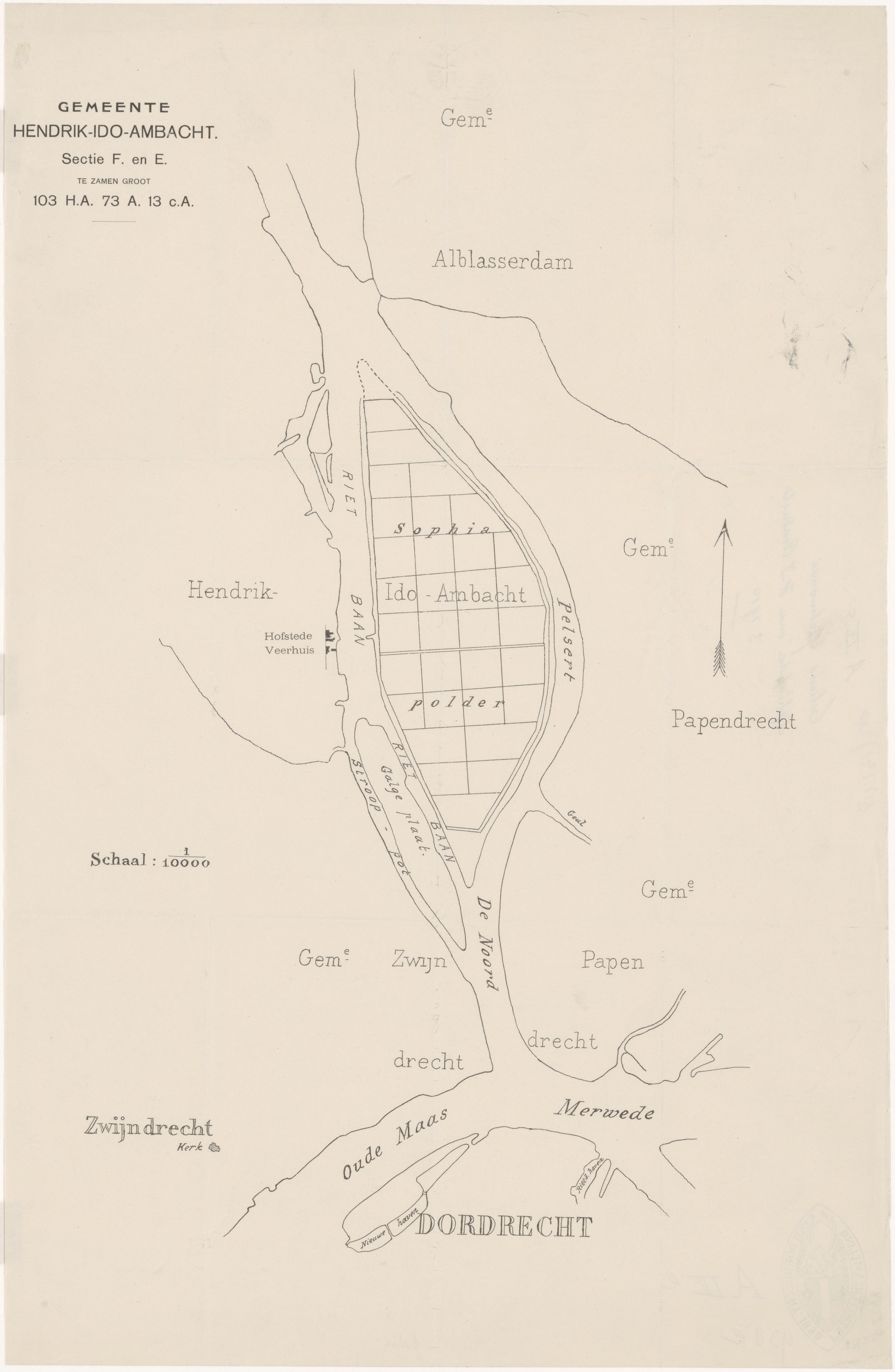 - Kaart van de "in" de Noord - tussen Pelsert en Rietbaan - gelegen polder Sophia, welke onder Hendrik-Ido-Ambacht valt. In de Sophiapolder is een zeer rechtlijnig verkavelingspatroon zichtbaar.