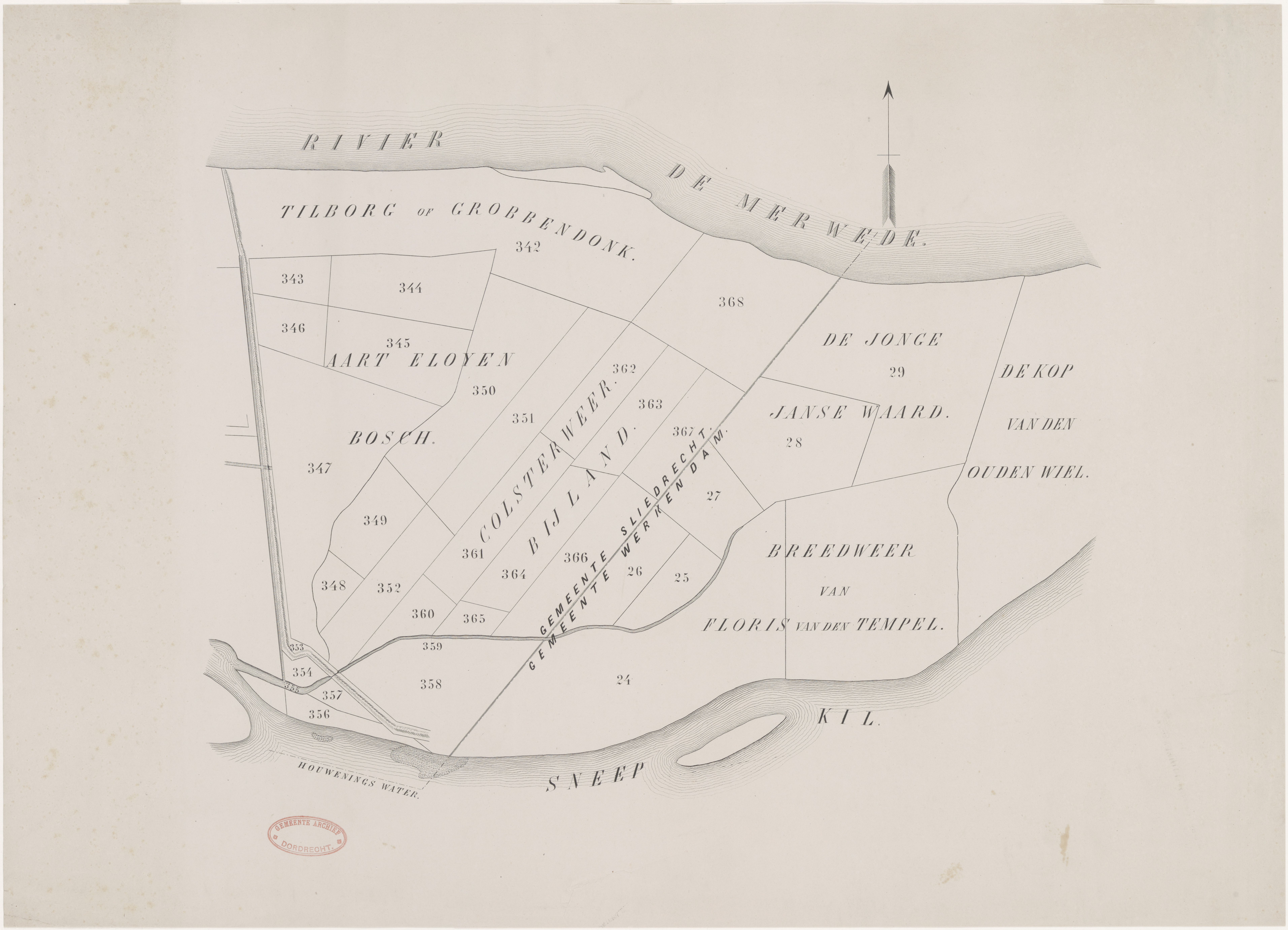 - Kaart van een aantal percelen land op de grens van de gemeentes Sliedrecht en Werkendam tussen de Beneden Merwede en de Sneepkil. Tevens met vermelding van toponiemen.