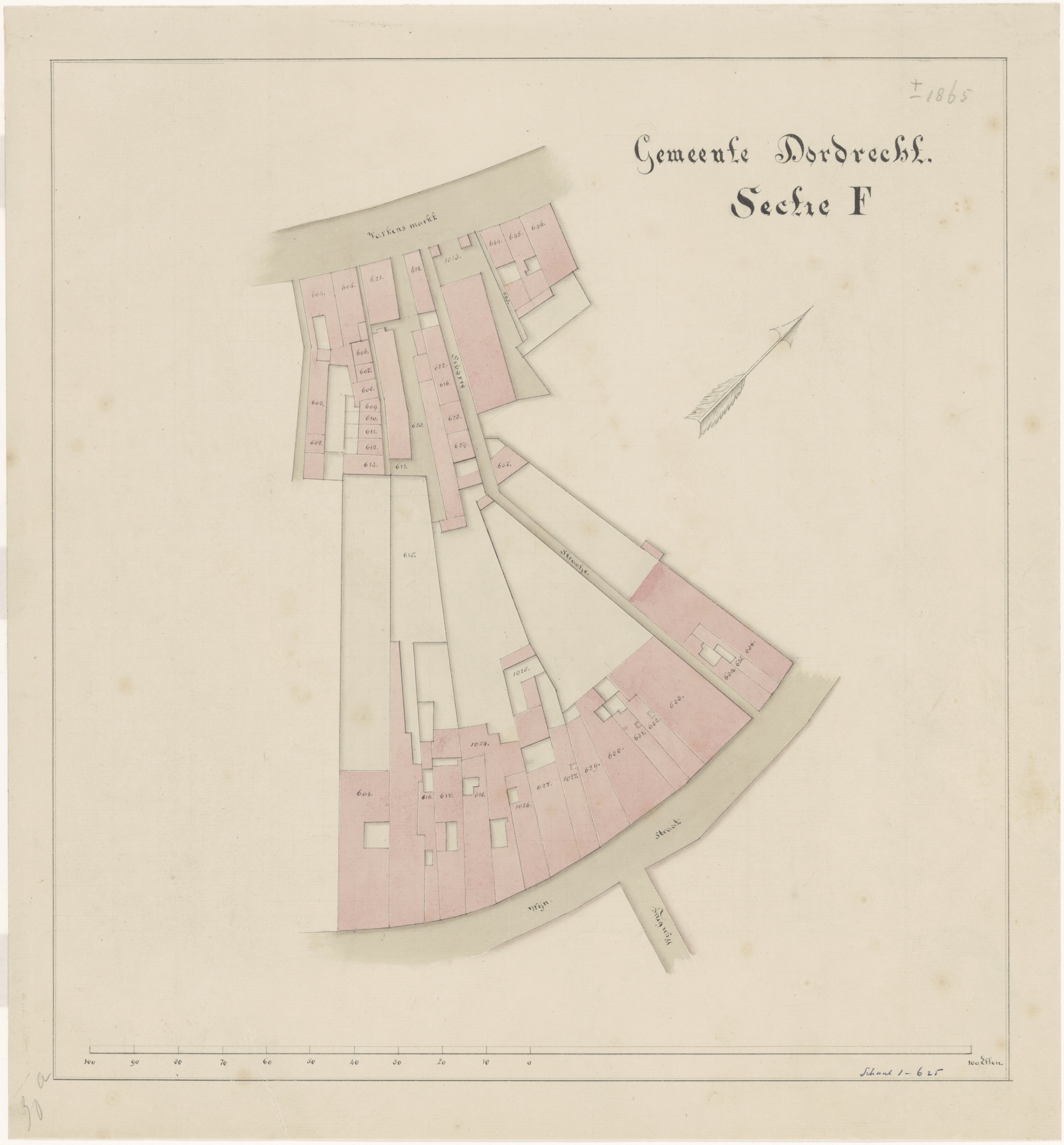 Kaart van de bebouwing tussen de Wijnstraat en de Varkenmarkt ter hoogte van het zgn. Siboriestraatje.