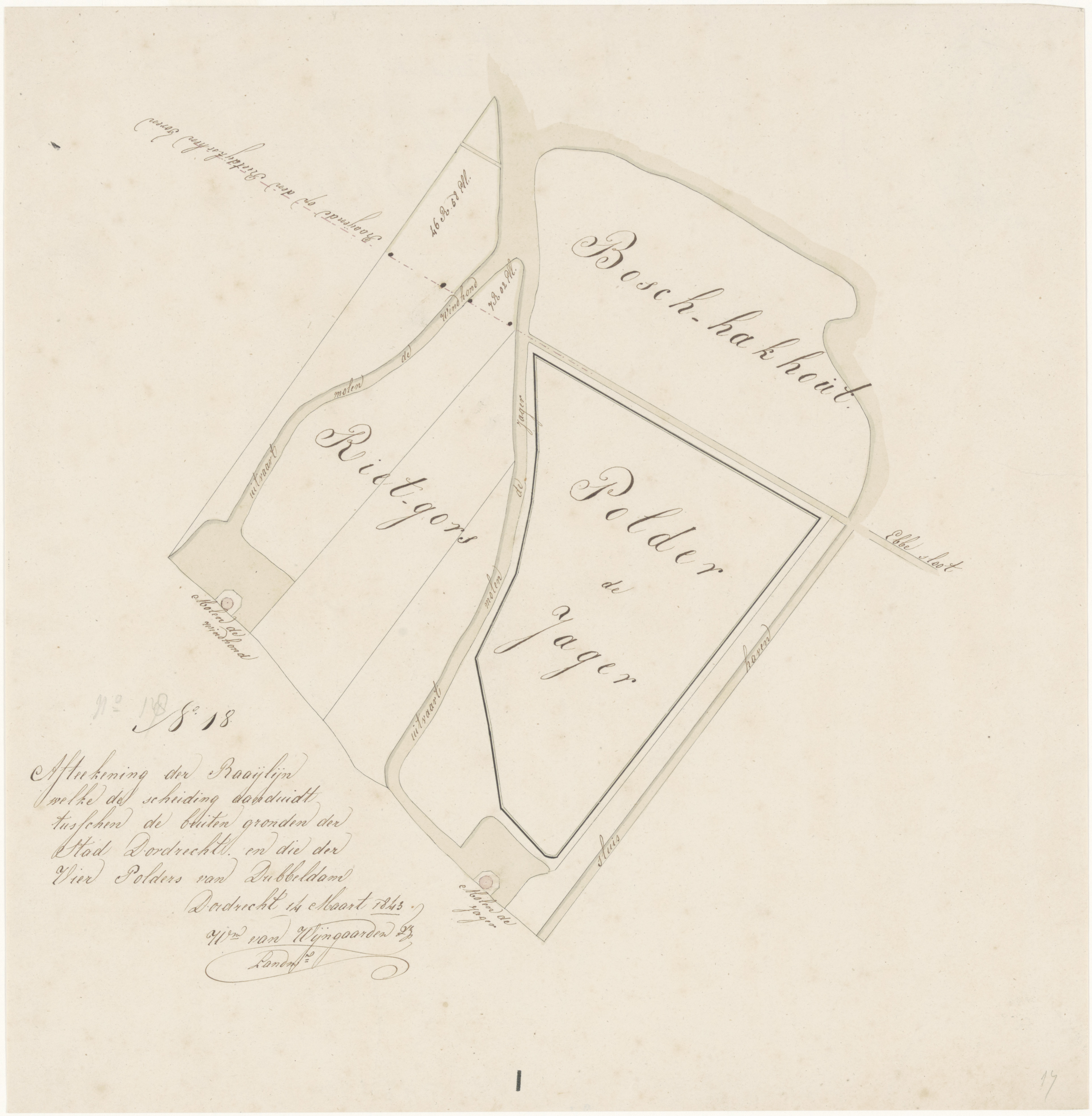 - Kaart van met name Polder de Jager (met bedijking) bij de molens De Windhond en De Jager, met aanduiding van de raailijn op de Riedijkse toren.