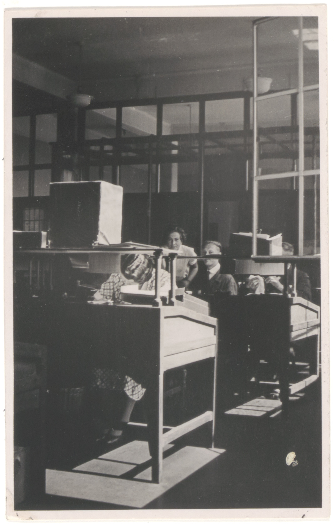 Het kantoorgebouw van de Eerste Nederlandsche Levensverzekering Maatschappij aan de Bellevuestraat met over hun werk gebogen kantoorbedienden.