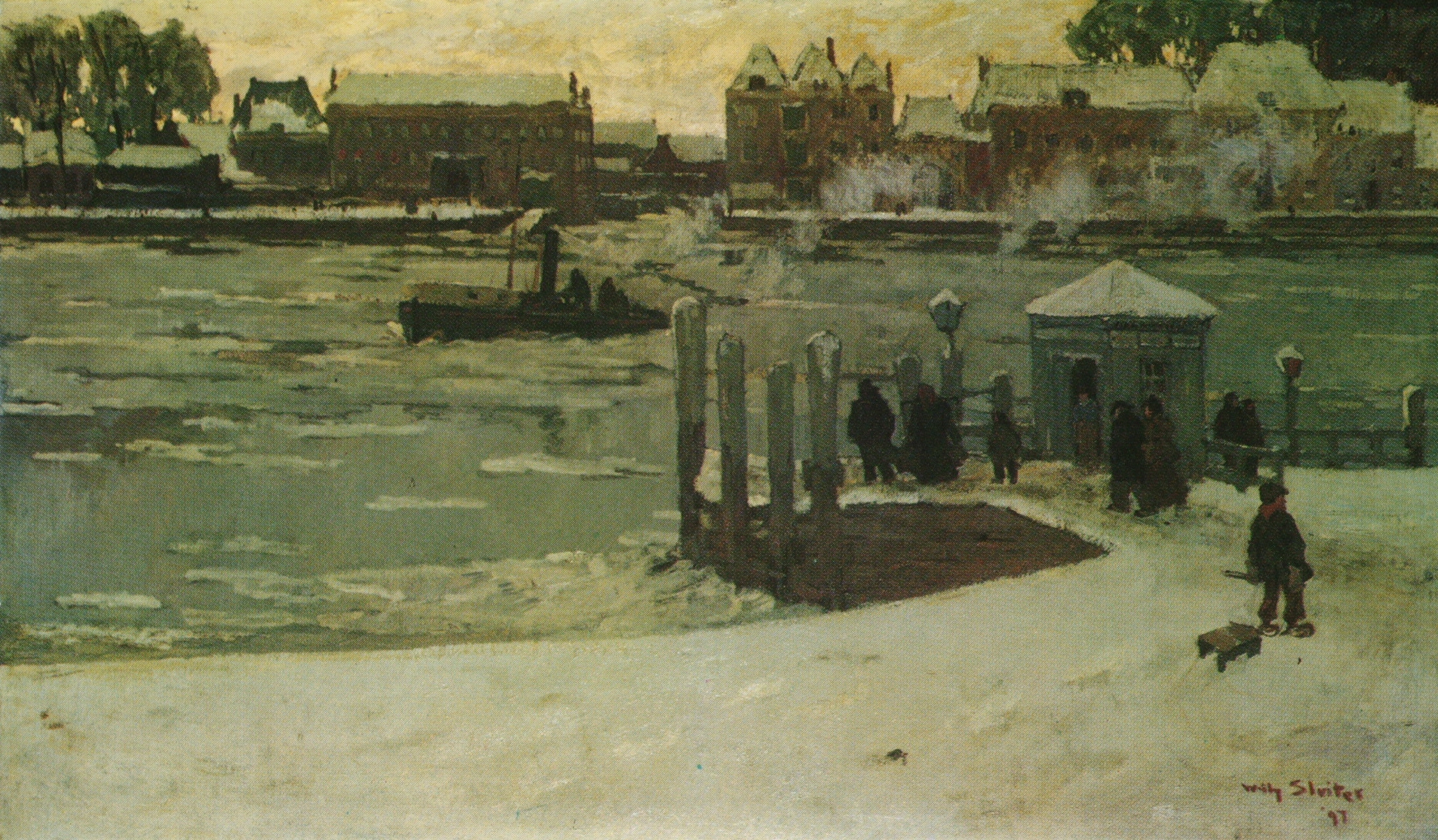 Schilderij door Willy Sluiter (1873-1949): Het Zwijndrechtse veer bij ijsgang.