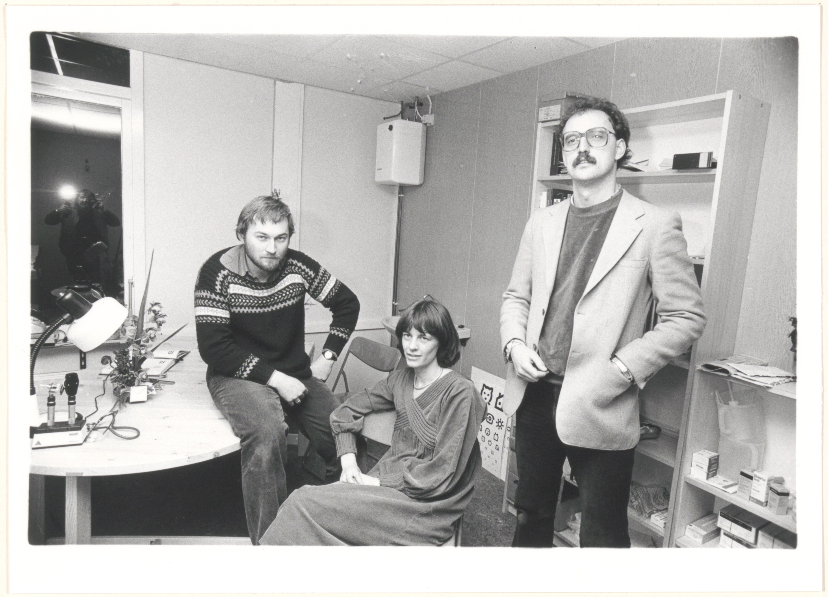 - De uit drie artsen bestaande huisartsengroep Stadspolders, die op 19 januari 1982 een praktijk startte, voorlopig in een keet aan de Ploegstraat. V.l.n.r. R.J. de Vos, L.C. Zuydveld en M.A.M. van Wijk.