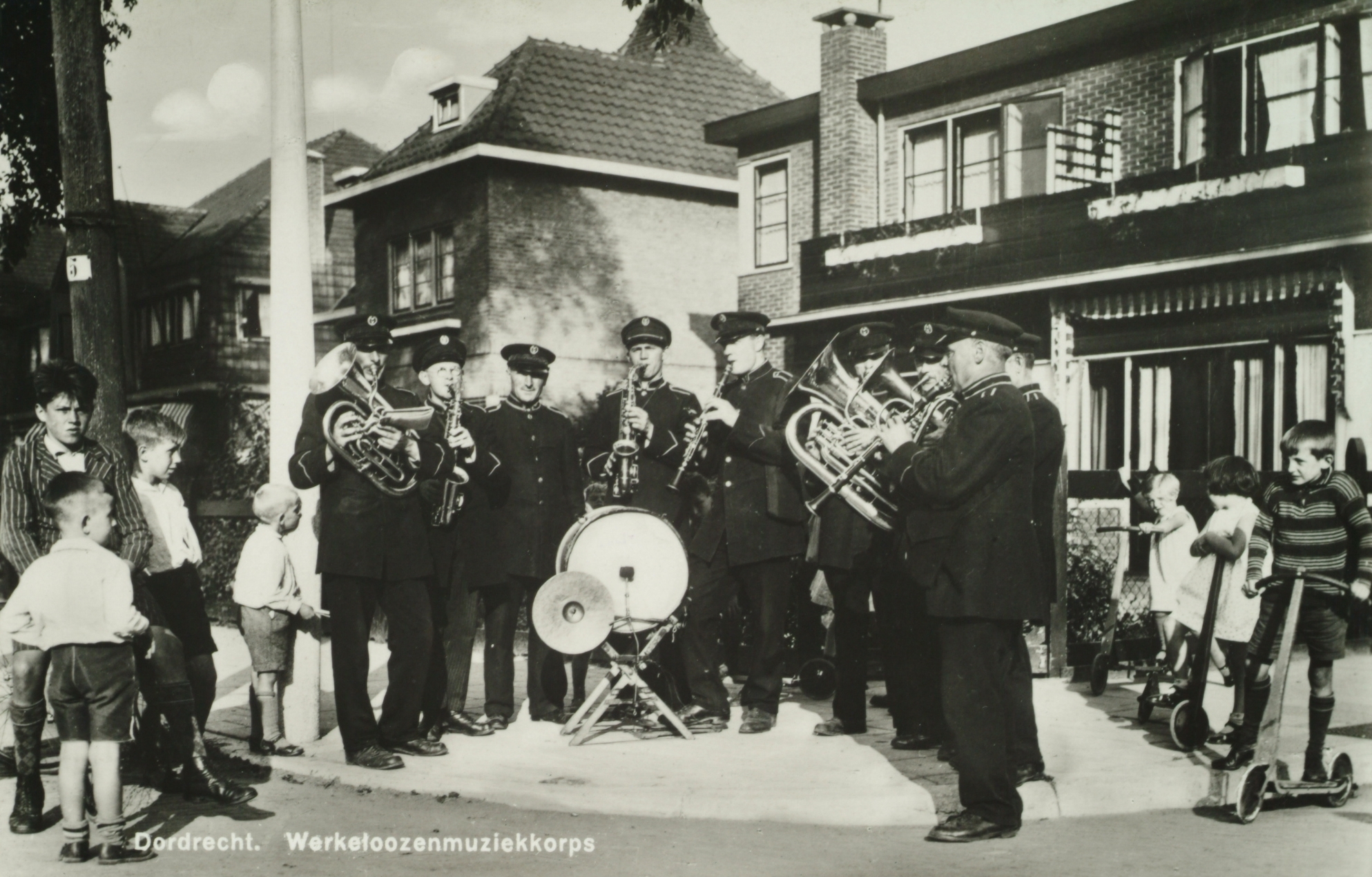 Werkelozenmuziekkorps op de Korte Scheidingsweg. V.l.n.r. Arie van der Net, Gerrit …