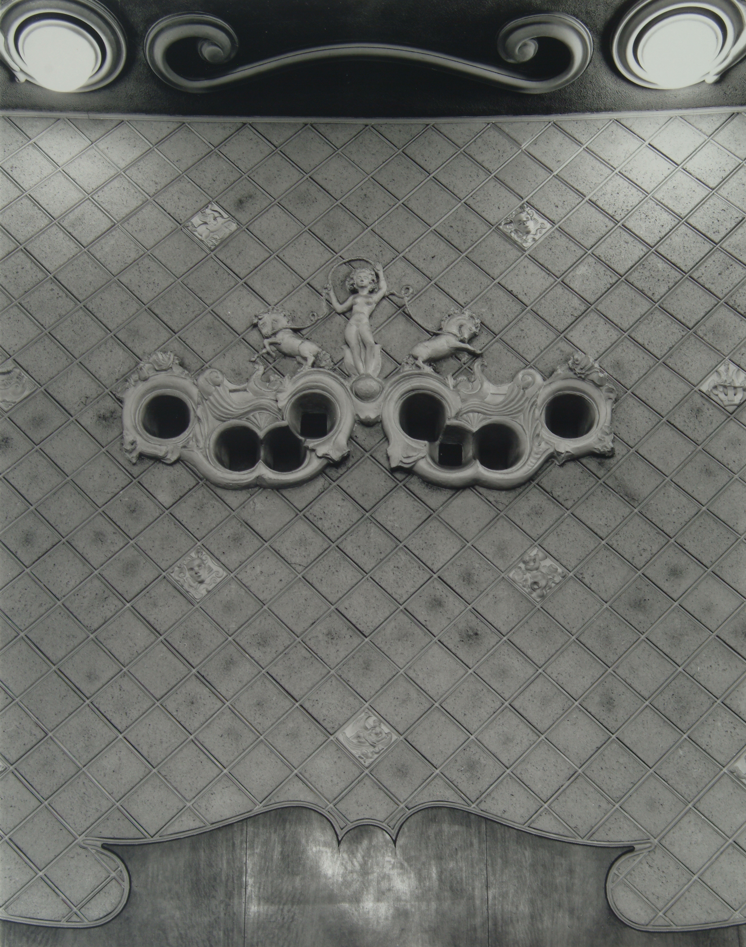 - Achterwand van de grote zaal van Kunstmin aan de Sint Jorisweg met details van het ontwerp van Sybold van Ravesteyn. De openingen zijn voor de erachter liggende filmcabine