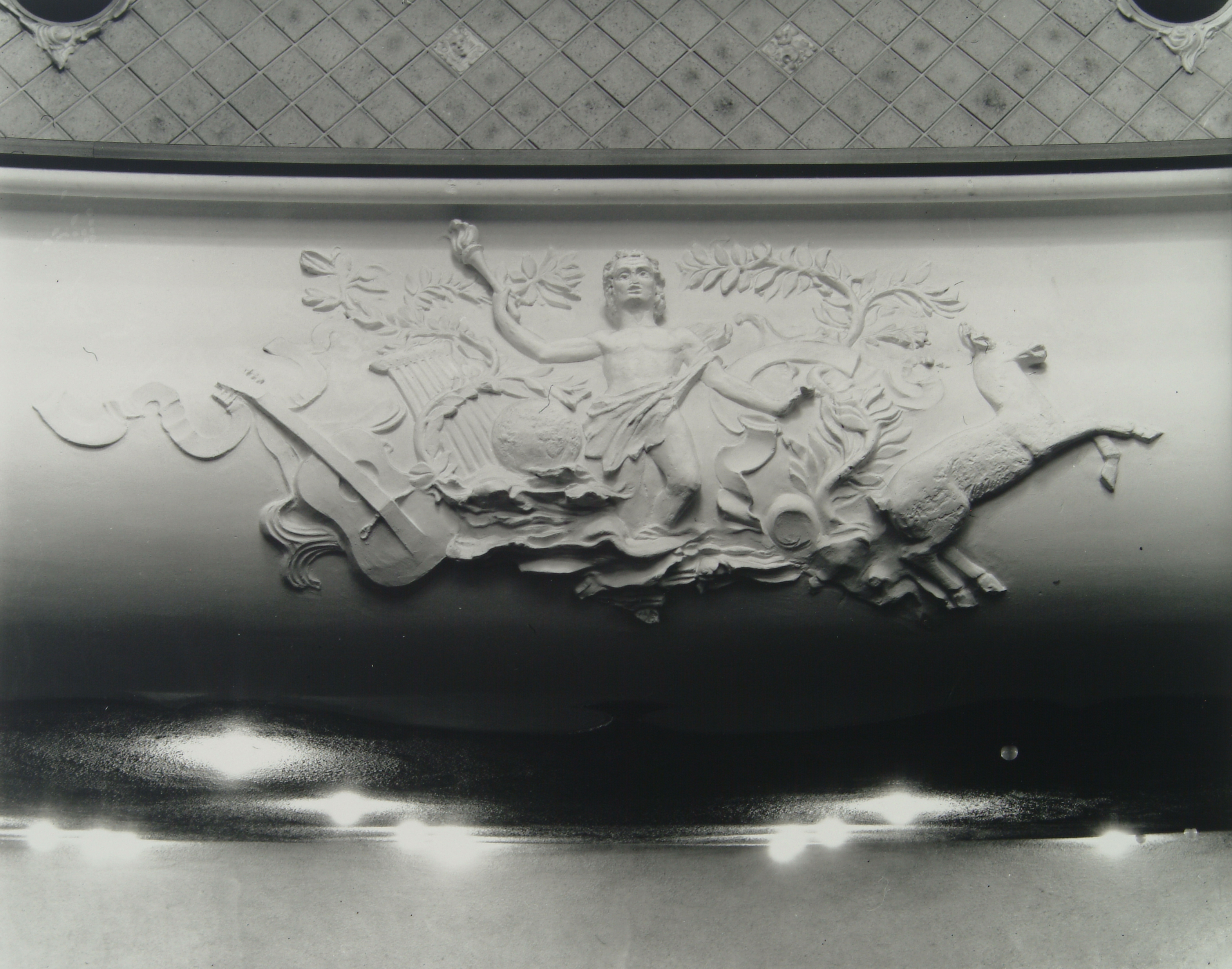 - Versiering op het balkon in de grote zaal van Kunstmin aan de Sint Jorisweg met details van het ontwerp van Sybold van Ravesteyn