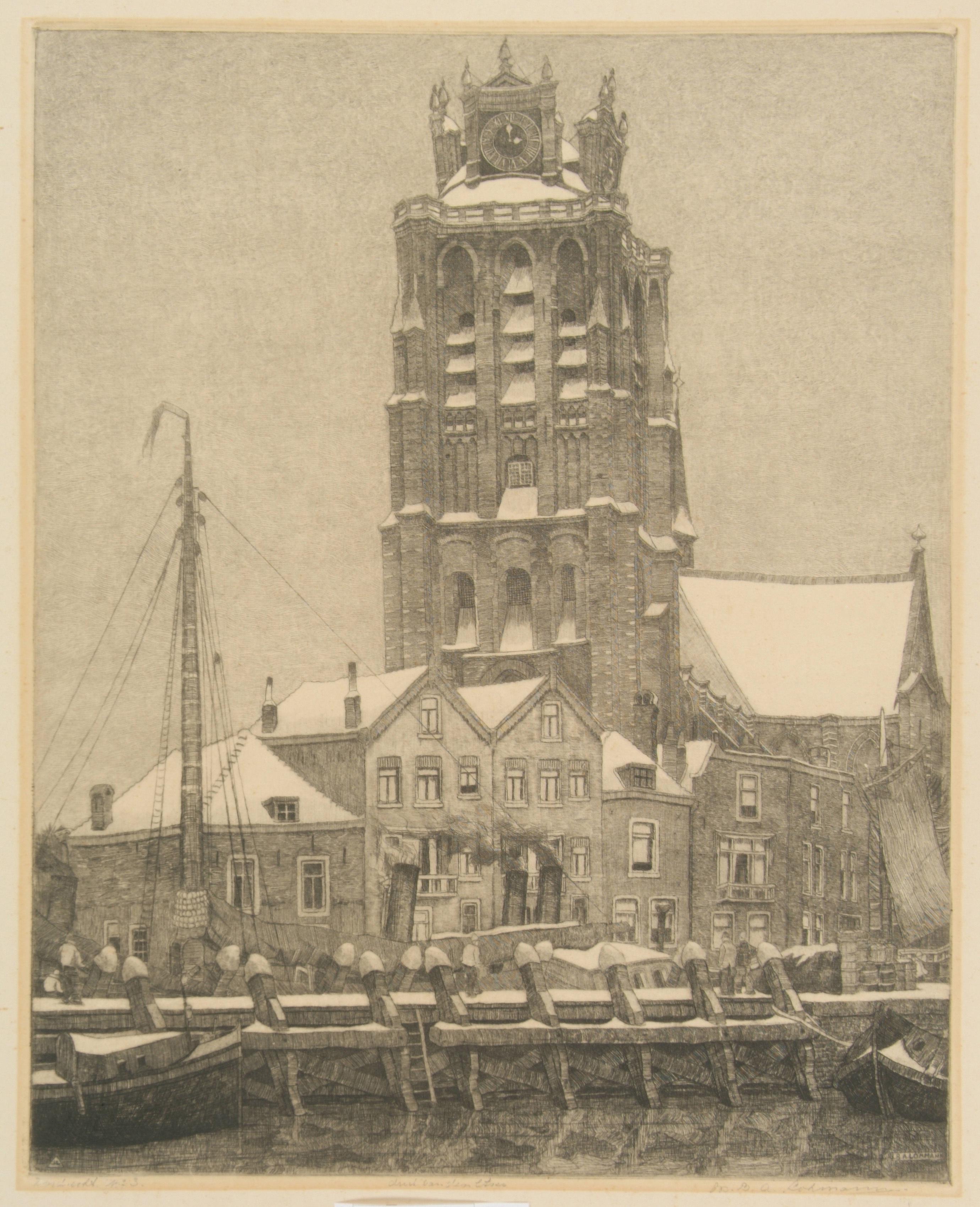 De Grote Kerk in de sneeuw, gezien vanaf de Bomkade.