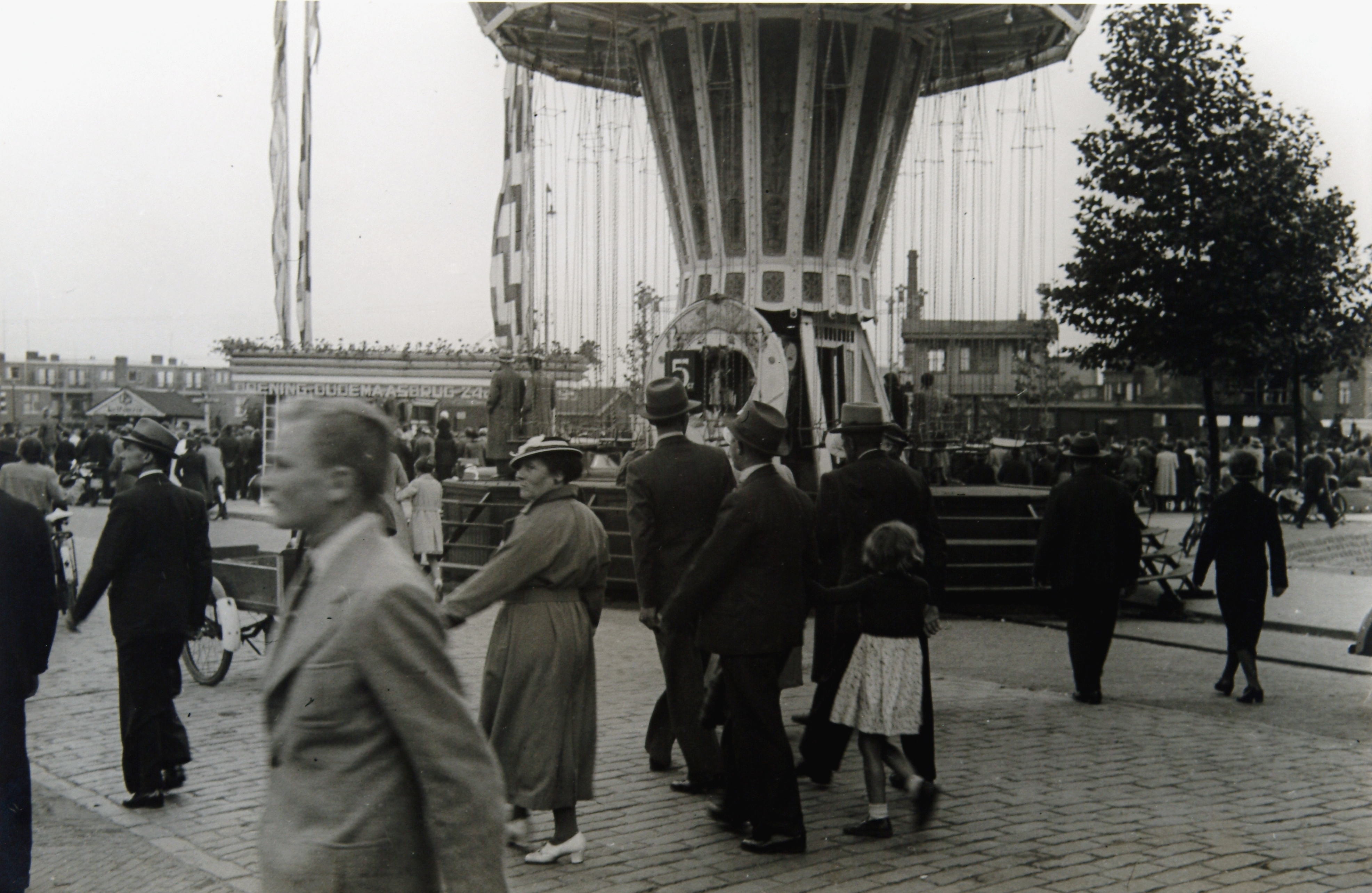 - Een optocht t.g.v. de opening van de verkeersbrug over de Oude Maas trekt over de Burgemeester de Raadtsingel. Vanaf Dubbeldamseweg naar het zuiden gezien.