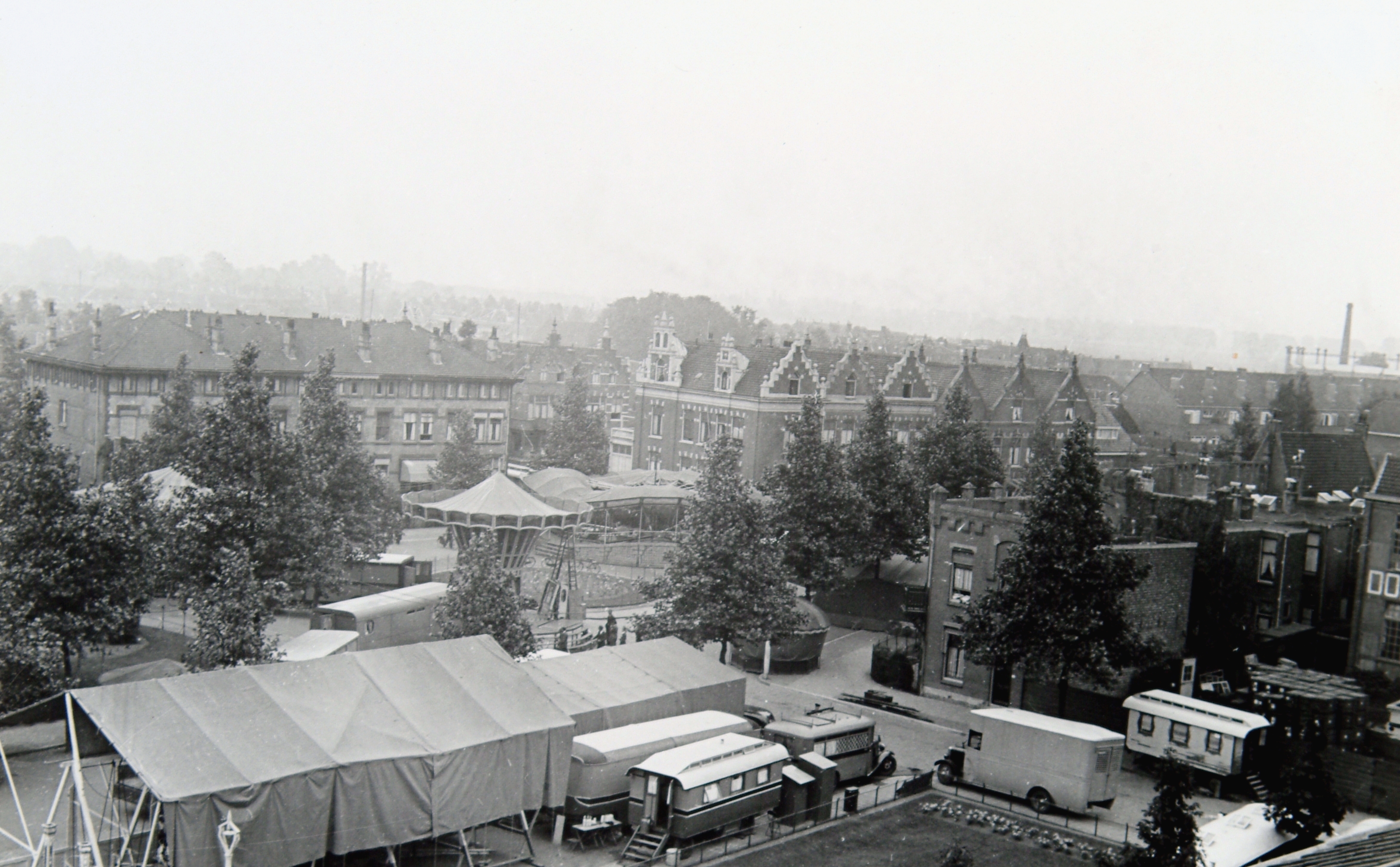 - Opslag van kermisattracties in het Oranjepark na de feestweek bij de opening van de verkeersbrug over de Oude Maas. Foto vanaf de H.B.S. naar het zuidwesten.