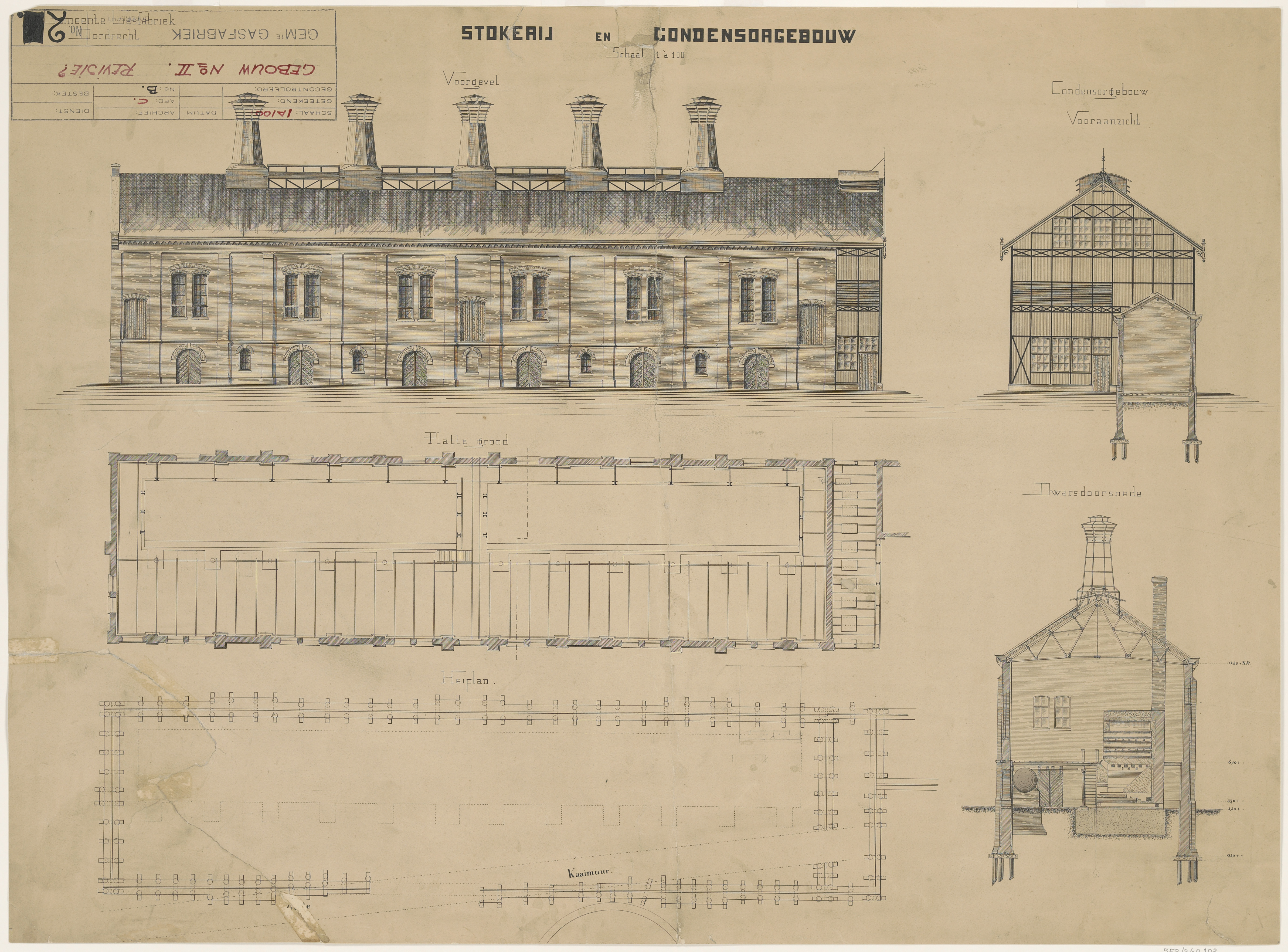 De bouwtekening van een stokerij en condensorgebouw voor de Gasfabriek aan de Merwekade.