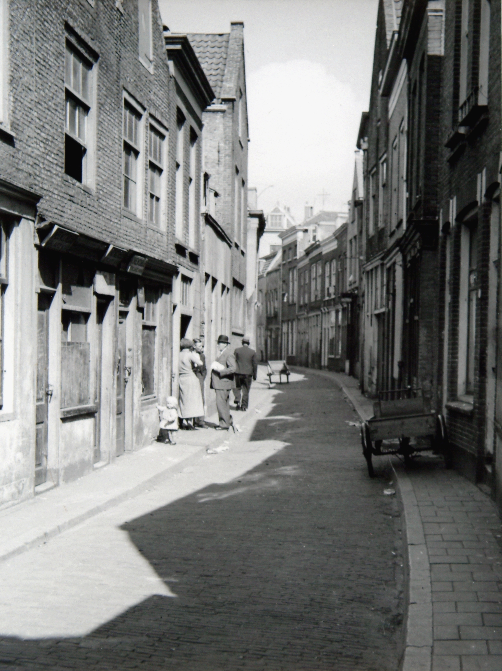 - De Torenstraat gezien vanaf het Nieuwkerksplein, richting Voorstraat. Tussen de mensen en de kar links, is de ingang naar de Wijngaardstraat.