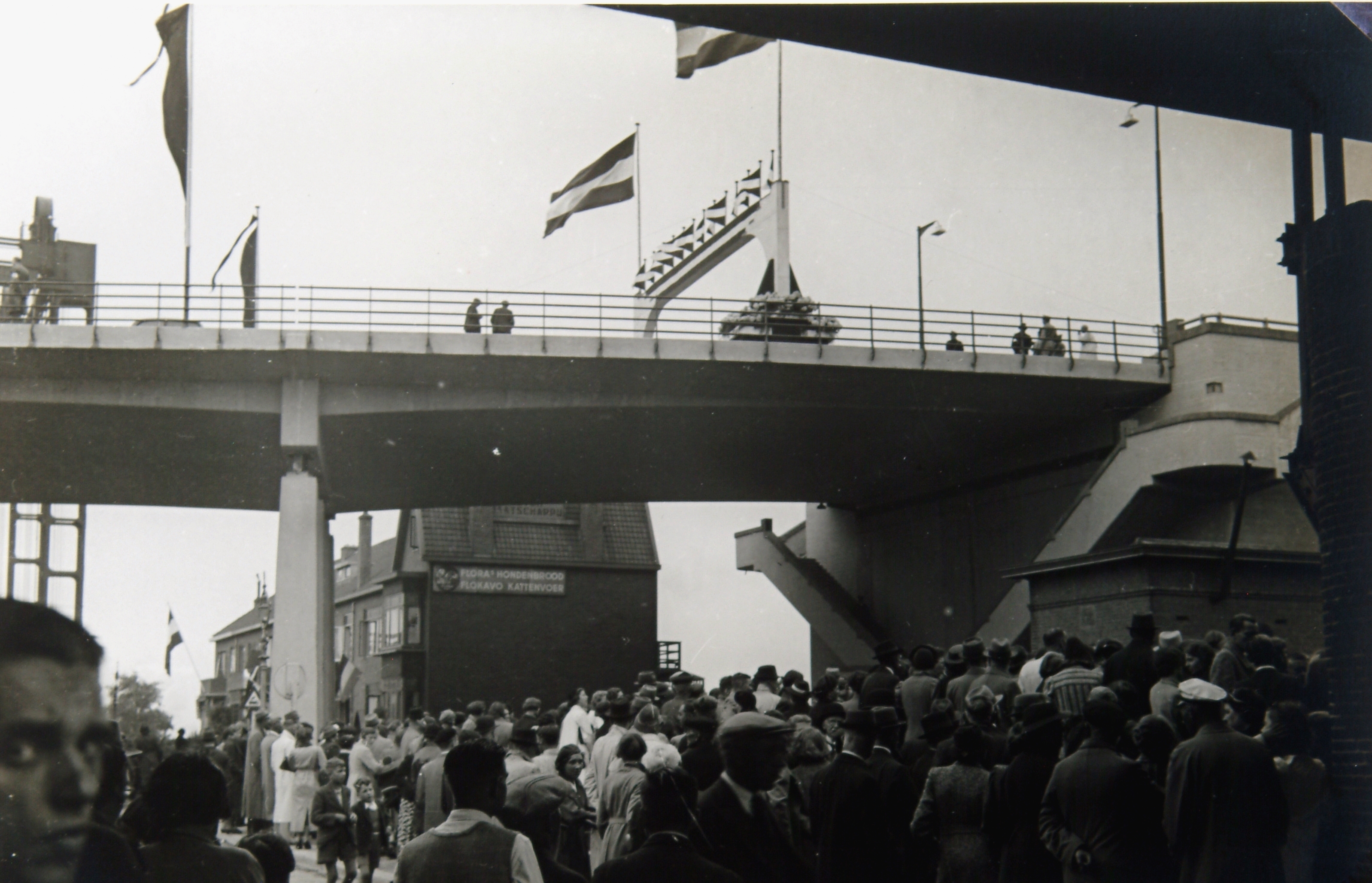 - Ondanks zeer slecht weer was de publieke belangstelling bij de opening van de verkeersbrug over de Oude Maas groot. De Dokweg, naar het zuiden gezien.