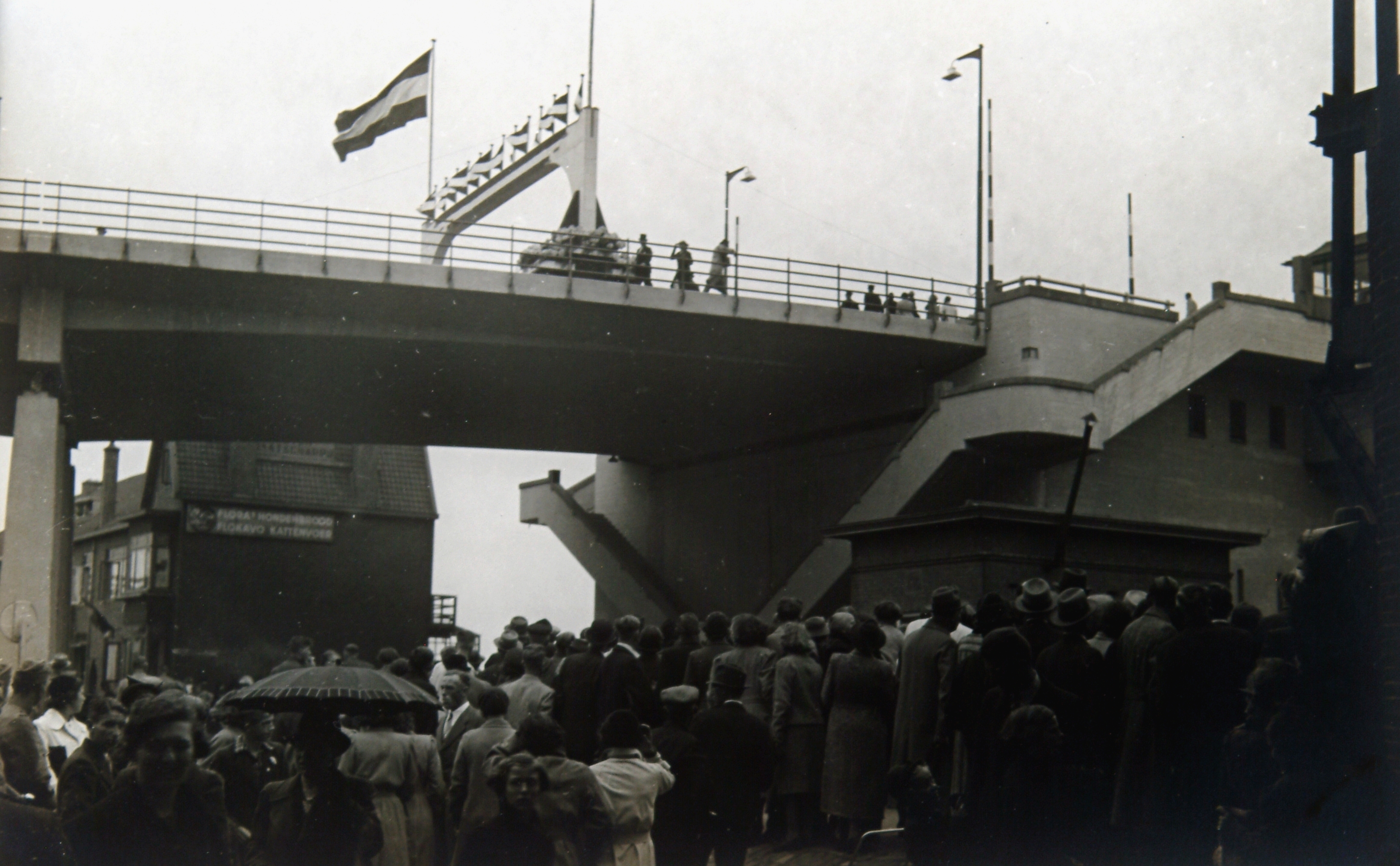 - Ondanks zeer slecht weer was de publieke belangstelling bij de opening van de verkeersbrug over de Oude Maas groot. De Dokweg, naar het zuiden gezien.