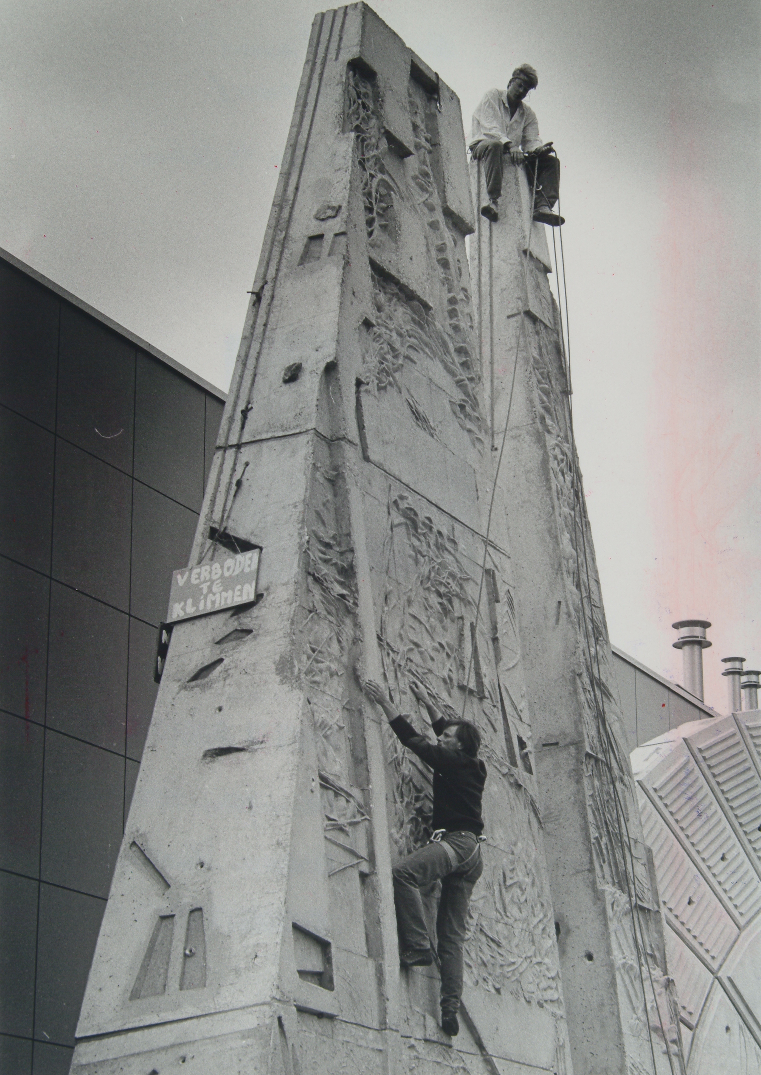 Kunstwerk van Boudewijn Paijens aan de Romboutslaan in gebruik als klimmuur