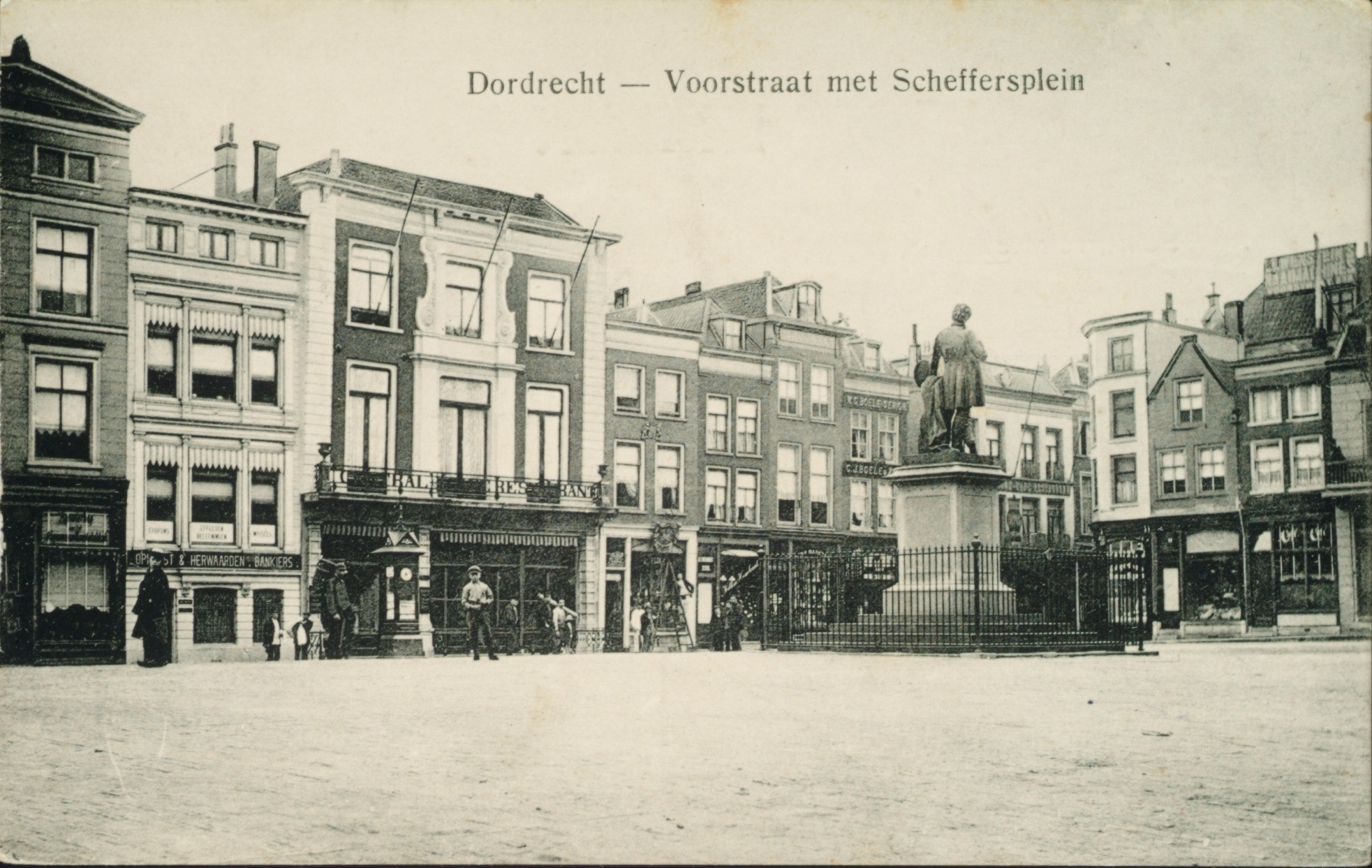 - Het Scheffersplein met het standbeeld van Ary Scheffer en een blik richting Voorstraat omstreeks 1908 Foto L. Kruijze