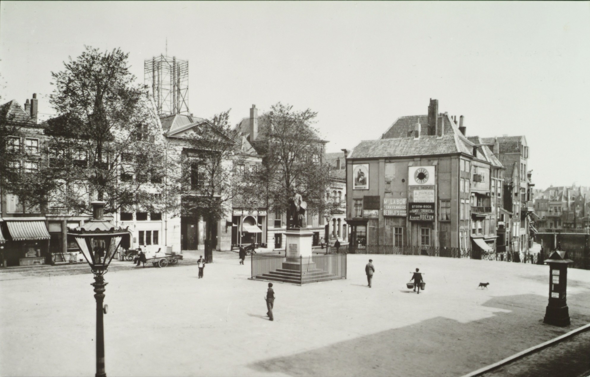- Het Scheffersplein met het standbeeld van Ary Scheffer en een blik richting Voorstraat omstreeks 1905. Op de achtergrond een mast voor de telegraafverbindingen. Foto H.J. Tollens