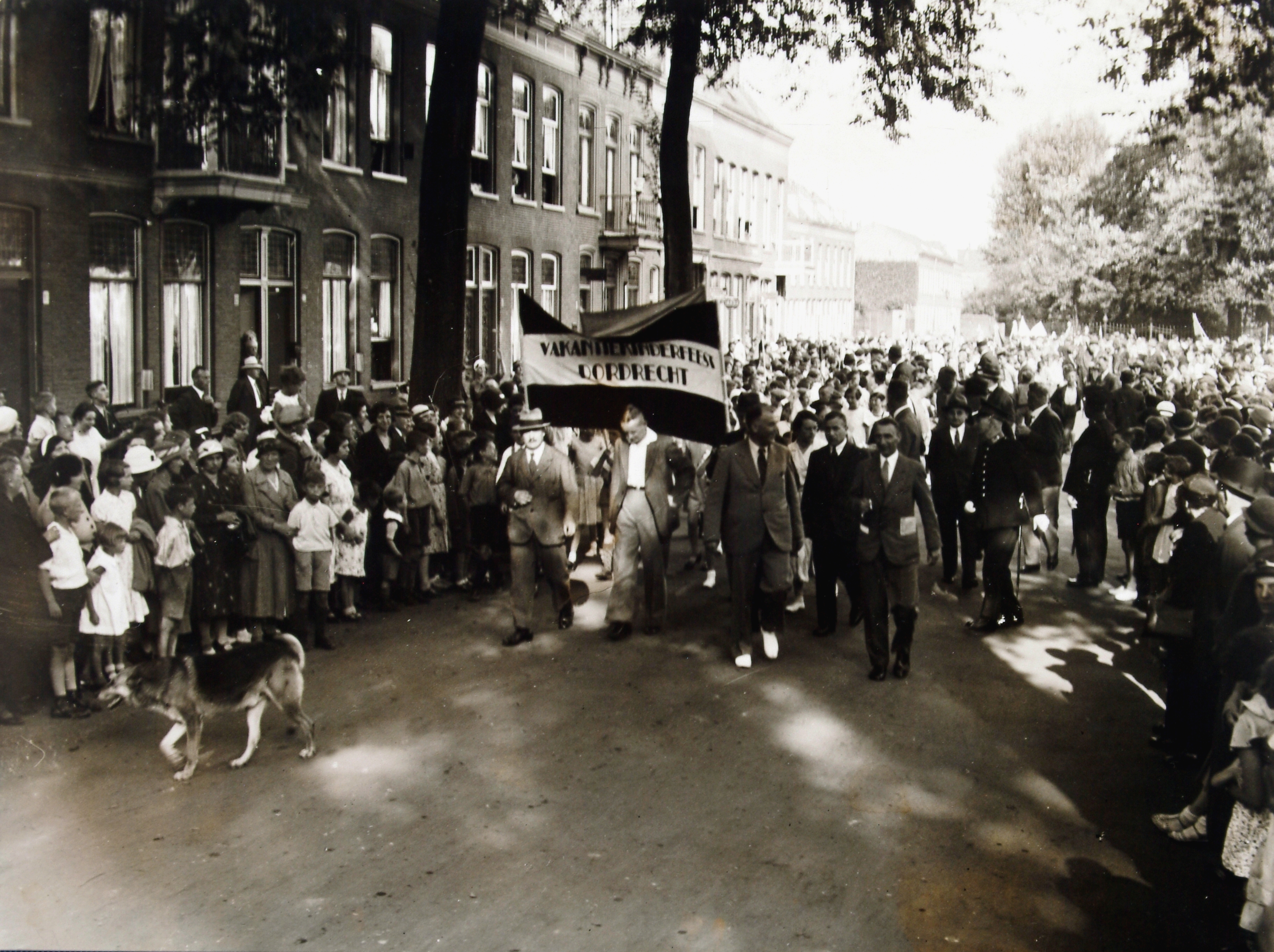 Deelnemers aan het vakantiekinderfeest zijn vertrokken vanaf het Beverwijcksplein en lopen in de Oudenhovenstraat.