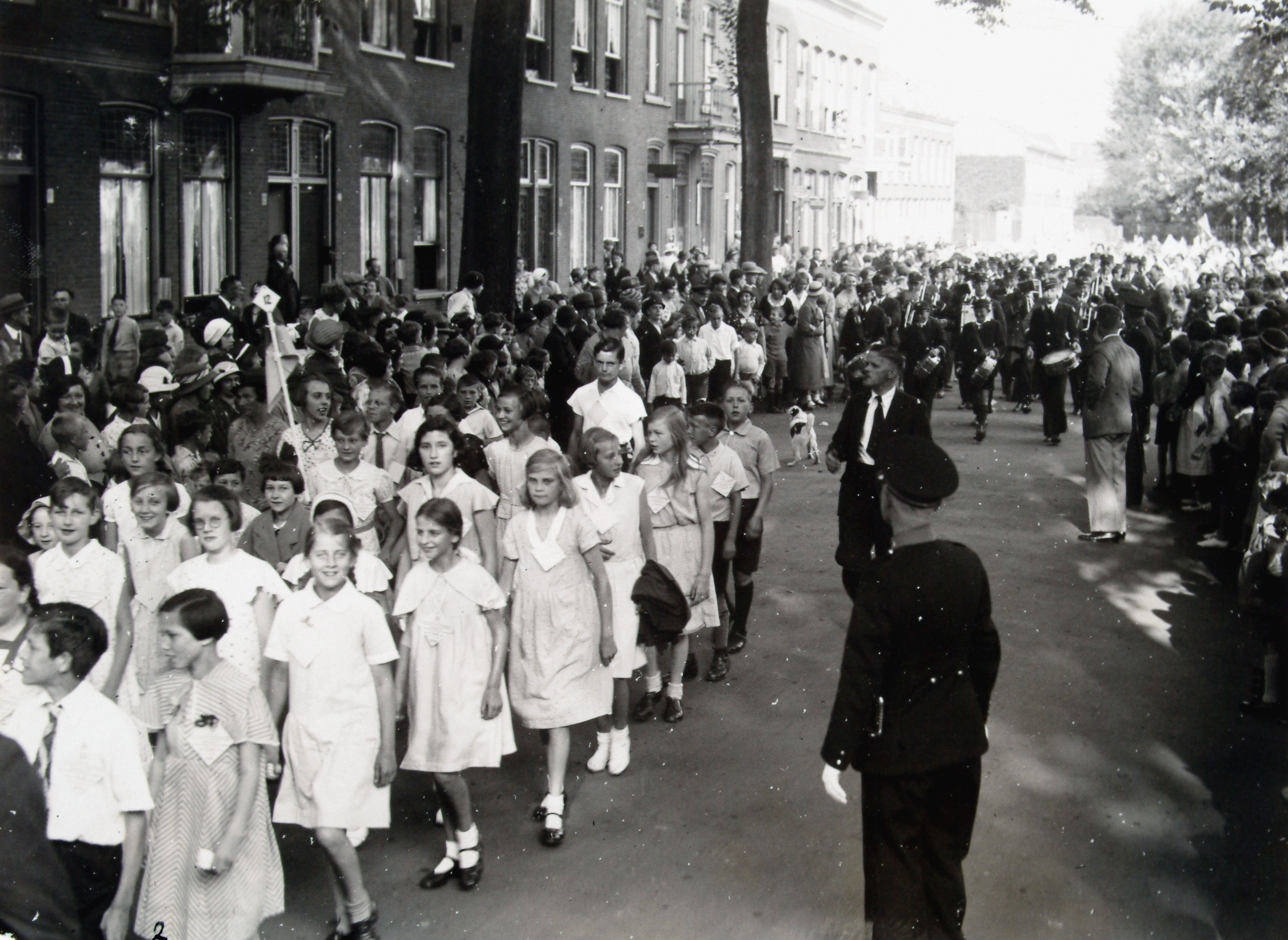 - Deelnemers aan het vakantiekinderfeest zijn vertrokken vanaf het Beverwijcksplein en lopen in de Oudenhovenstraat.