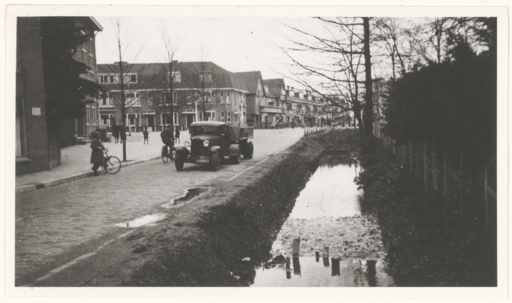 - Een kiepwagen van Openbare Werken met zand voor het dempen van sloten op de Hallincqlaan, gezien richting Groenedijk en Stooplaan.