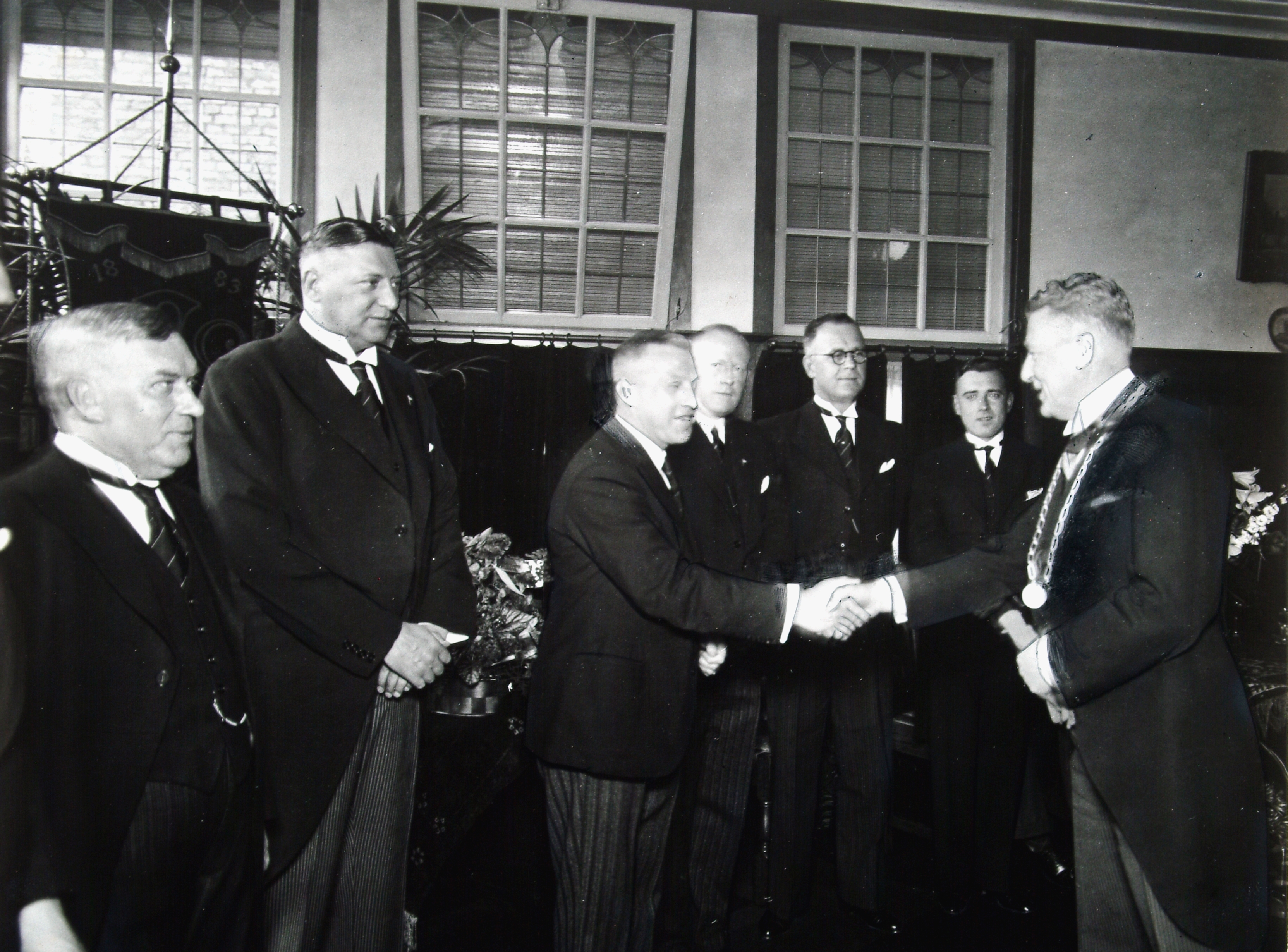 Burgemeester Bleeker complimenteert het bestuur van DFC op de receptie in Ter Merwe met …