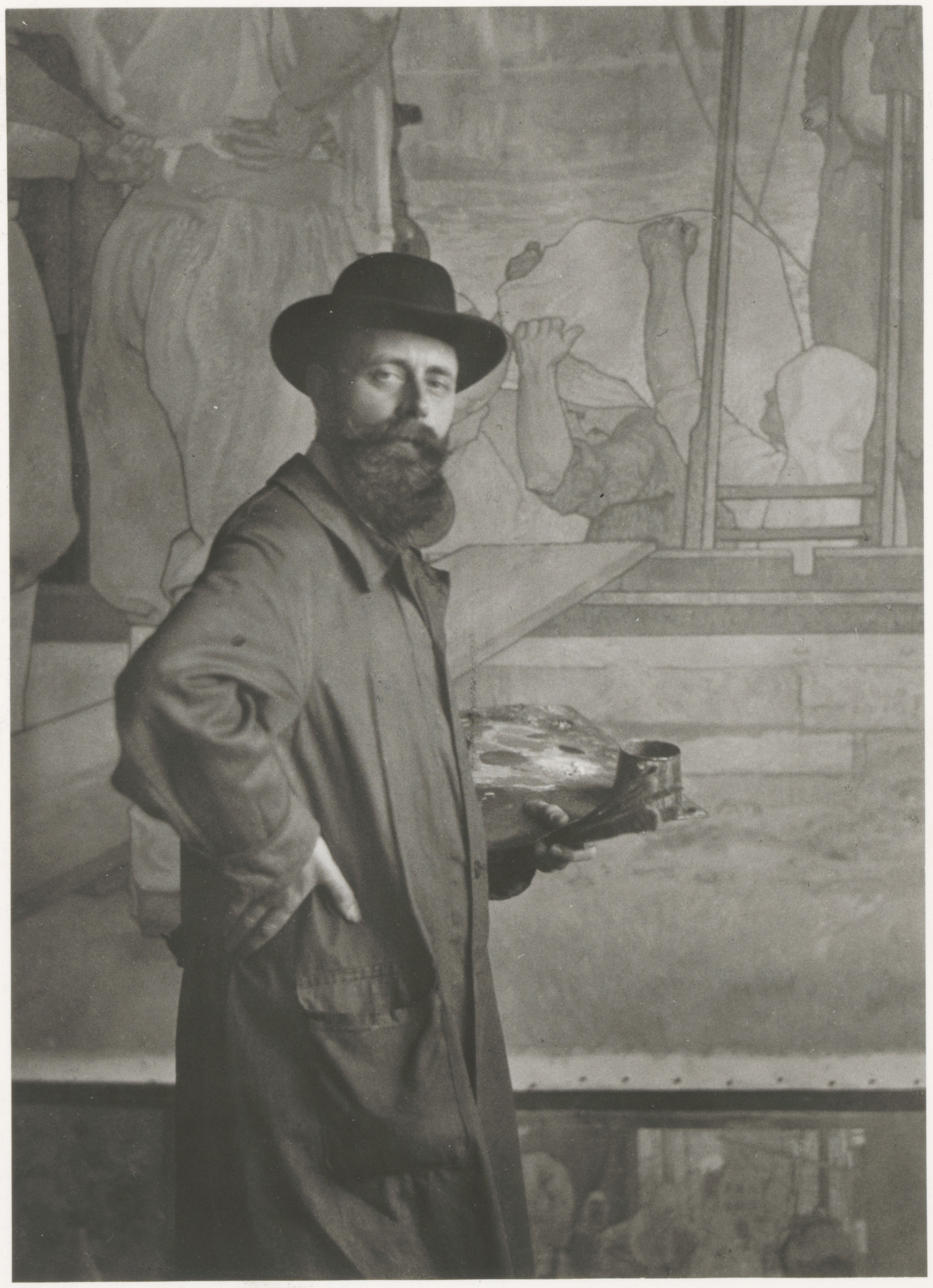 - De schilder Reinier Willem Kennedie, met hoed, geboren te Dordrecht 16 augustus 1881, overleden in Vrederust bij Bergen op Zoom 23 maart 1960, poserend met palet in de linkerhand voor zijn tweede wandschildering in de hal van het stadhuis met het thema 'De Gouden Eeuw te Dordrecht'.