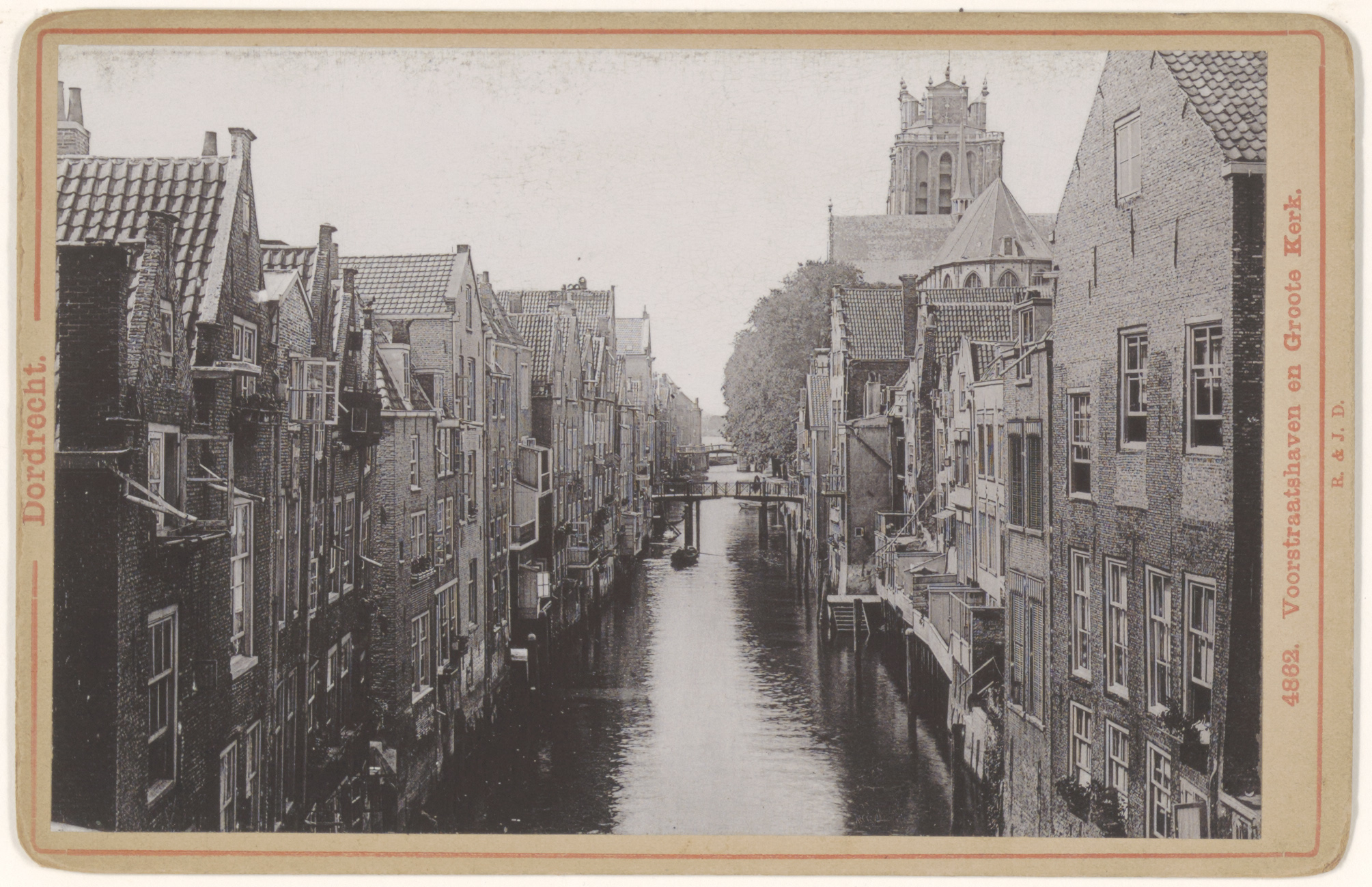 - Gezicht vanuit een hoog punt in het huis op de Lombardbrug op de Voorstraatshaven in de richting van de Pelserbrug en de Leuvebrug. Links de Voorstraat, rechts de Grotekerksbuurt en de Manhuissteger.