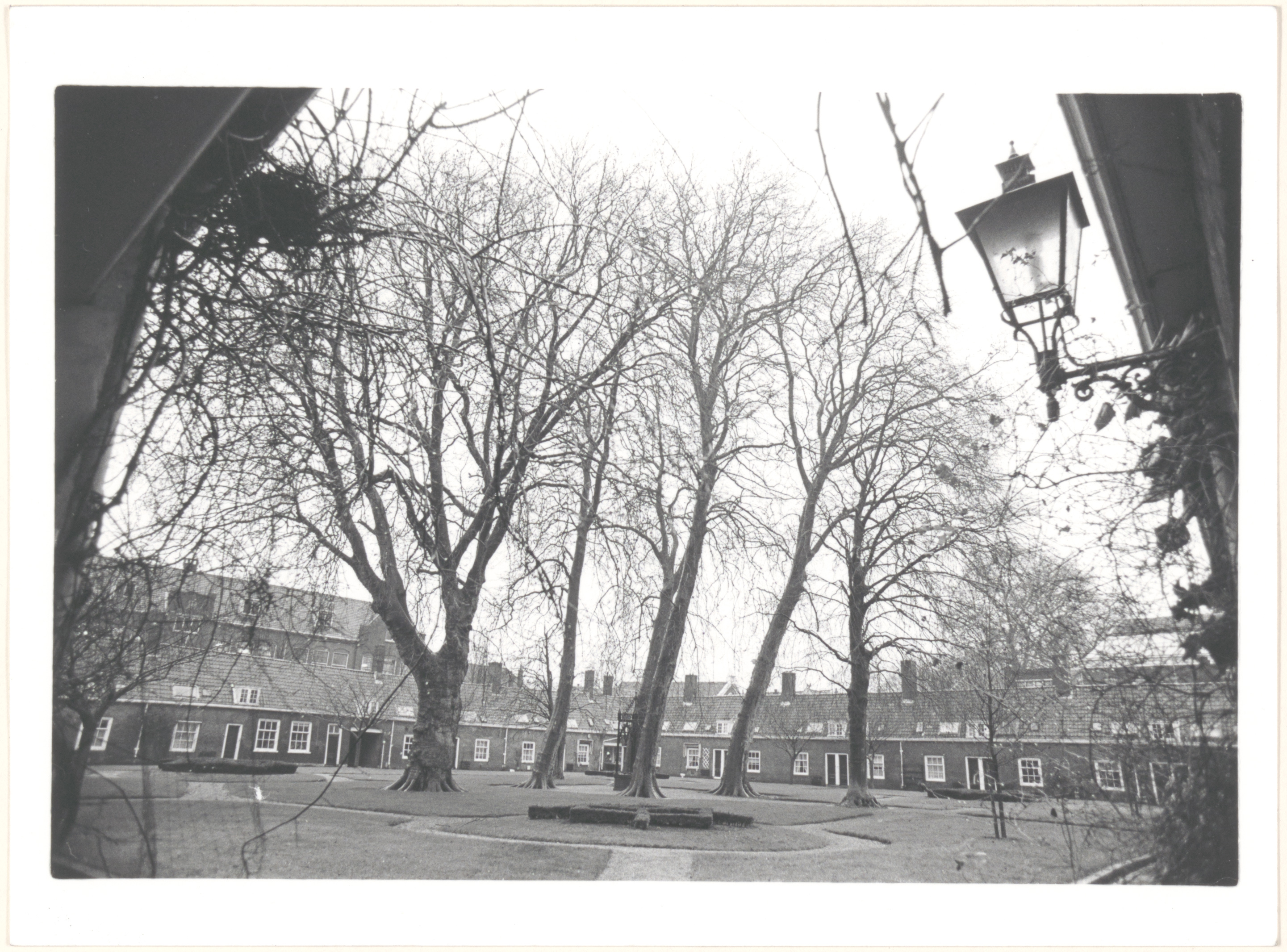 - Binnenhof van het Arend Maartenshof, diagonaal gefotografeerd met een groothoekobjectief.