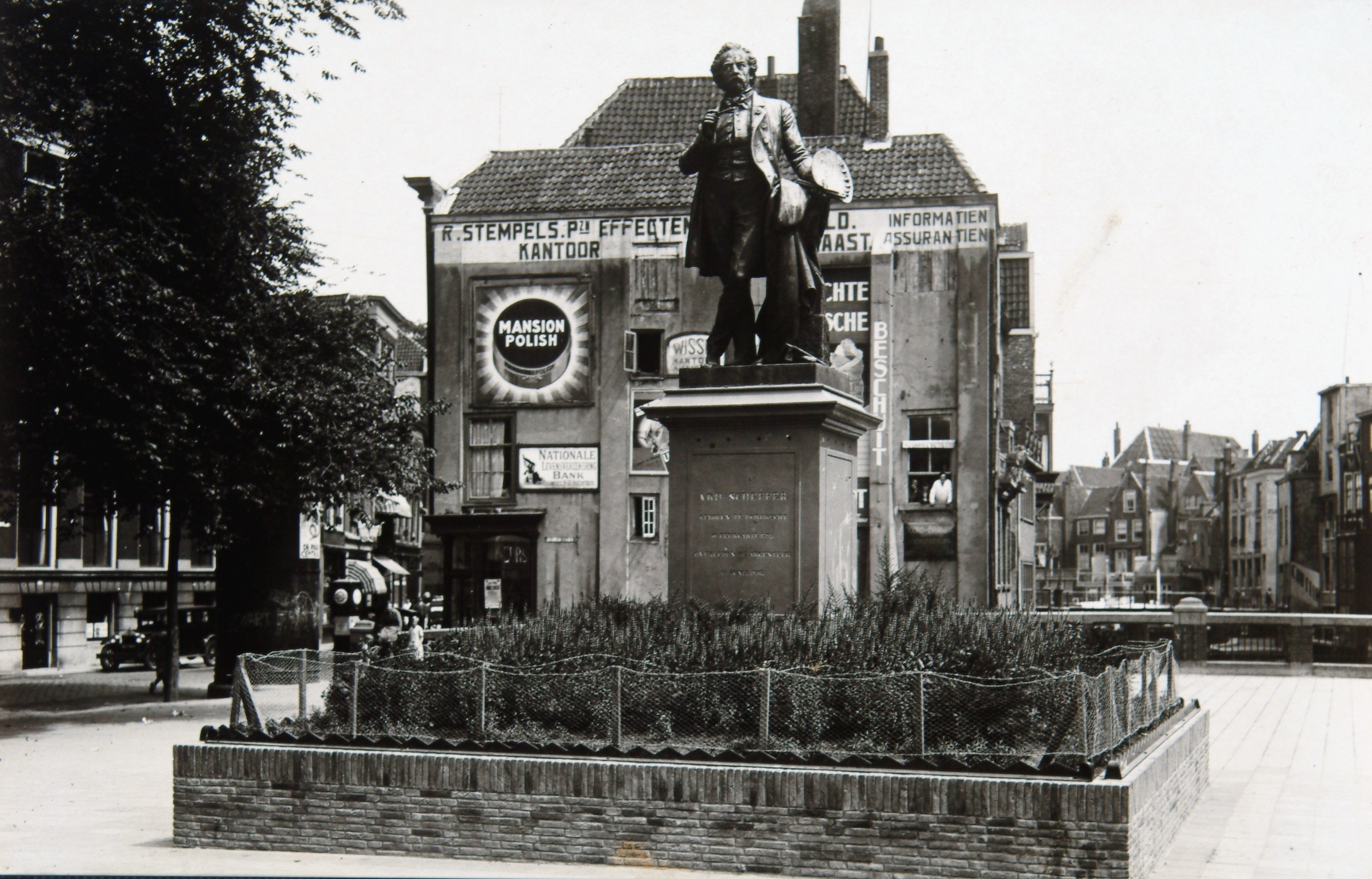 - Het Scheffersplein in noordoostelijke richting gezien, met het standbeeld van schilder Ary Scheffer. Het ijzeren hek rondom het beeld is vervangen. Links is de Wijnstraat met het pand van de marktmeester op de hoek. Rechts ziet men de achterkant van huizen aan de Voorstraatshaven.