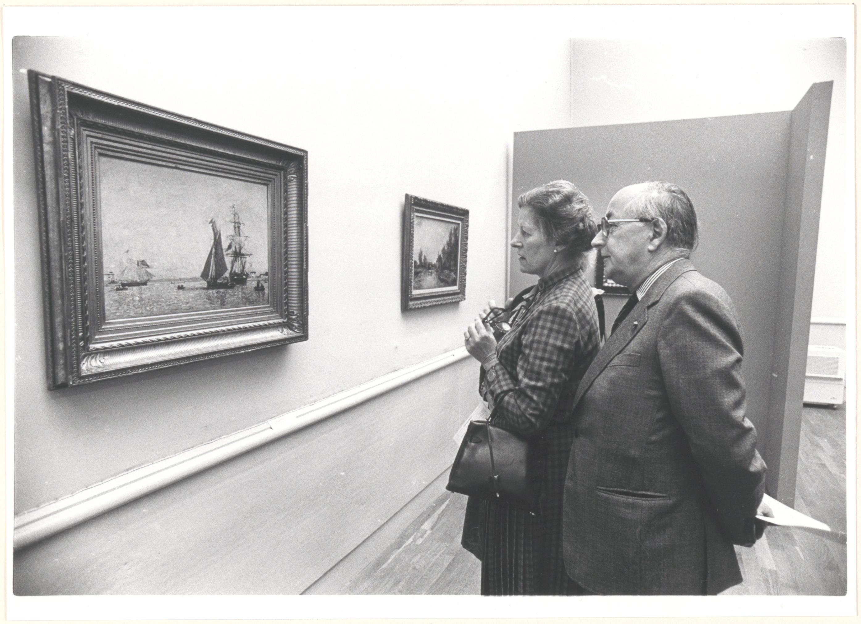 - Oud-burgemeester J.J. van der Lee en zijn echtgenote bekijken een schilderij van Jongkind op de tentoonstelling aan Jongkind gewijd in het Dordrechts Museum.