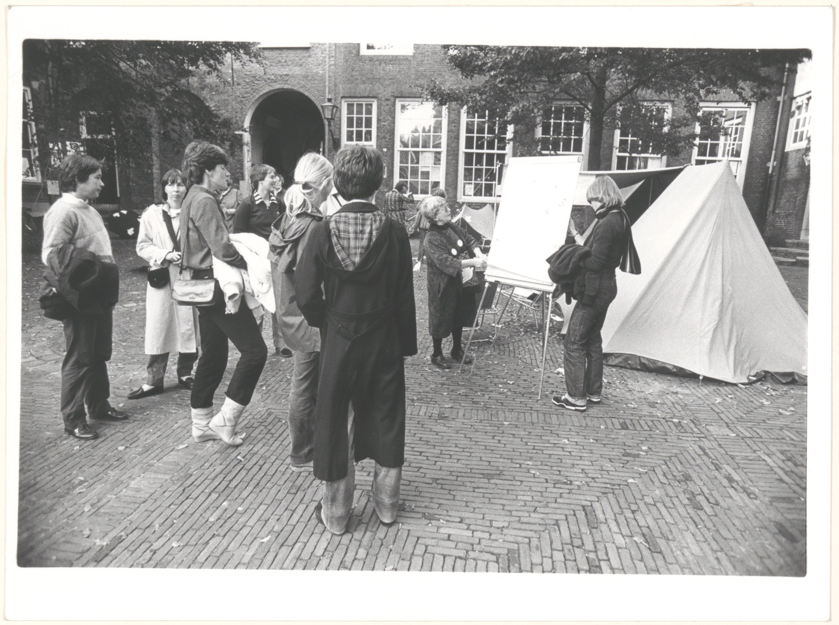- Vrouwen houden een symbolisch vredeskamp in het Hof; links van het bord staat Ank Ten Bosch-Stumpel (echtgenote van kunstenaar Lou Ten Bosch).