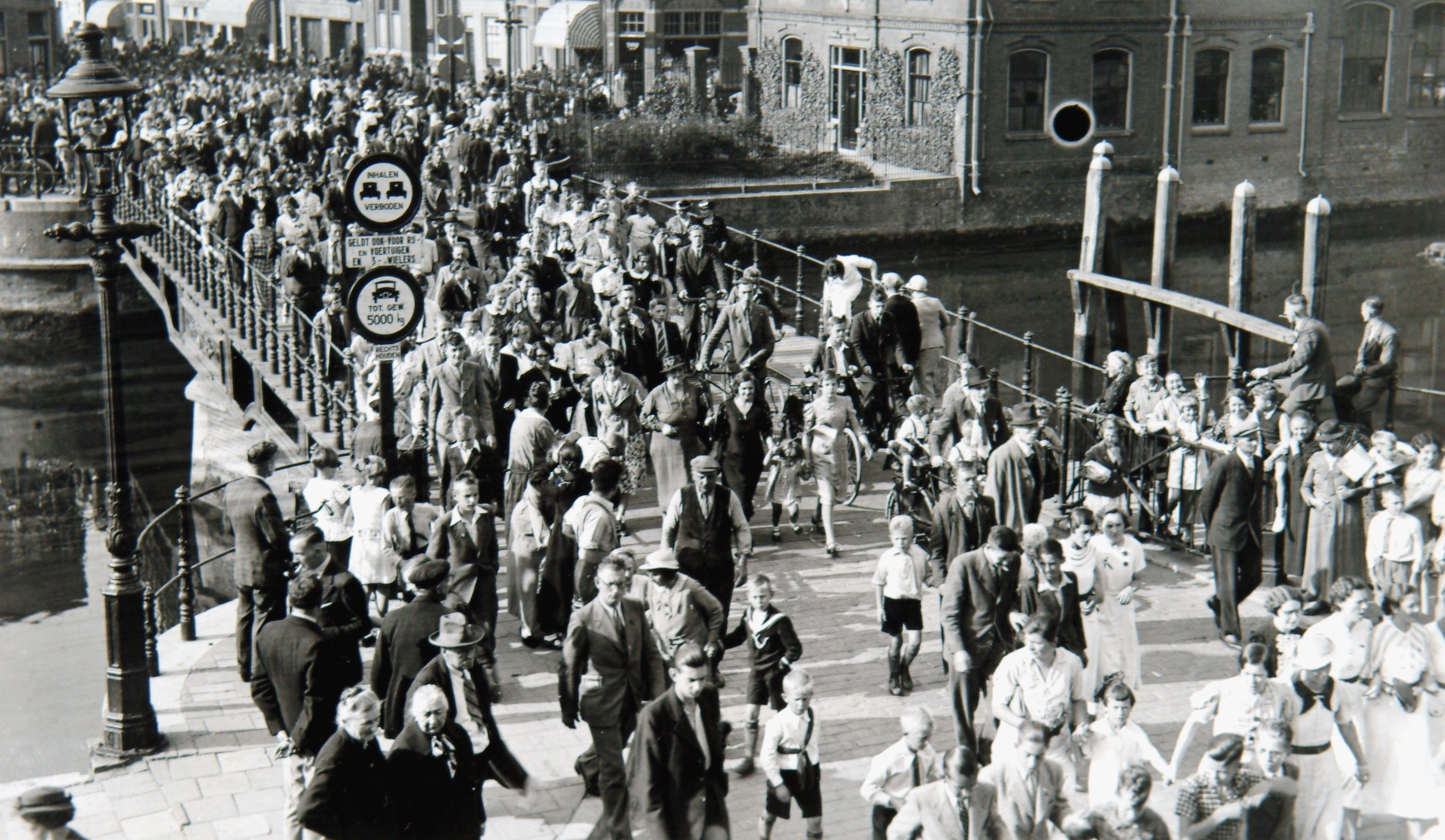 - De spuibrug vanaf het Spuiplein gezien in de richting van de Spuiweg. Net na het gebouw rechts - de B.L.O.-school van de heer Bunt - begon de Hellingen. Het publiek is op de been vanwege koninginnedag.