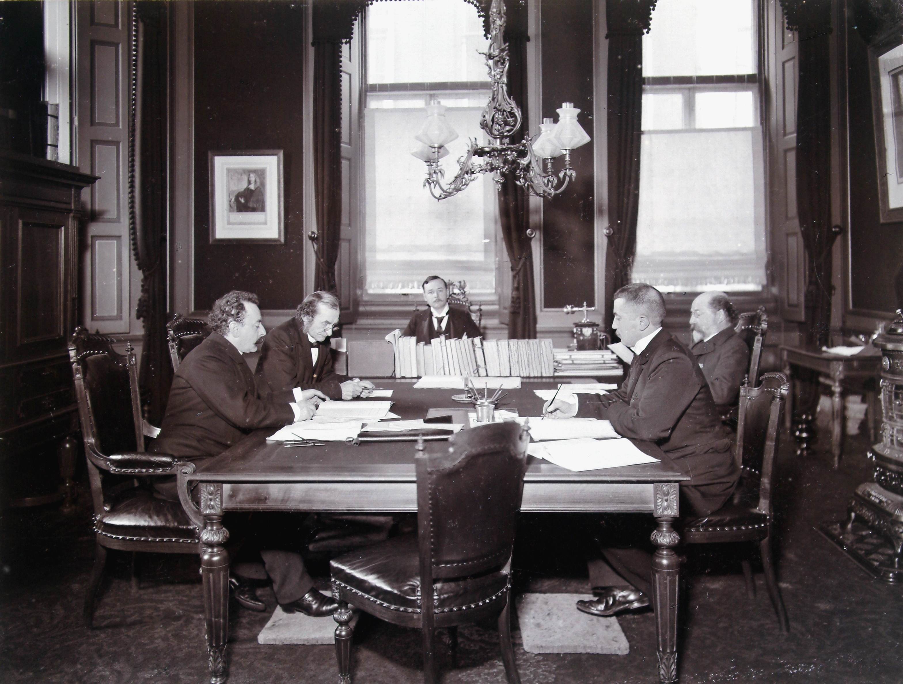 - De kamer van burgemeester en wethouders in het stadhuis. V.l.n.r. de wethouders G. van Aardenne (of Veth) en Hordijk, burgemeester Zimmerman, wethouder Veth (of Van Aardenne) en secretaris Van Houten.
