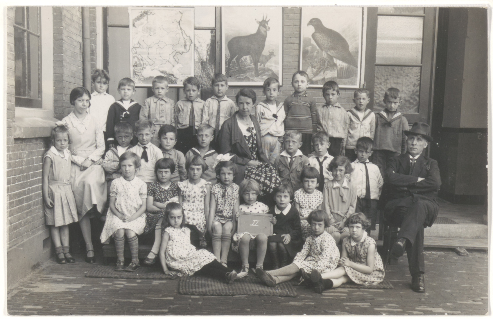 De klas II van de Geref. School voor LO en ULO aan de Vrieseweg, met hun onderwijzeres en onderwijzer.