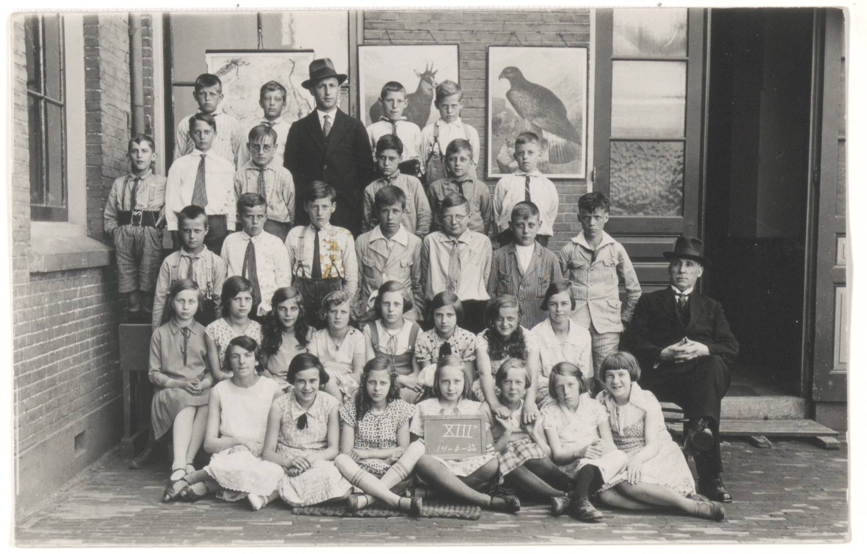 - De klas XIII van de Geref. School voor LO en ULO aan de Vrieseweg. Bovenste rij de heer M. Ottevanger en rechts het hoofd van de school H.J. Motshagen, poserend op het schoolplein.