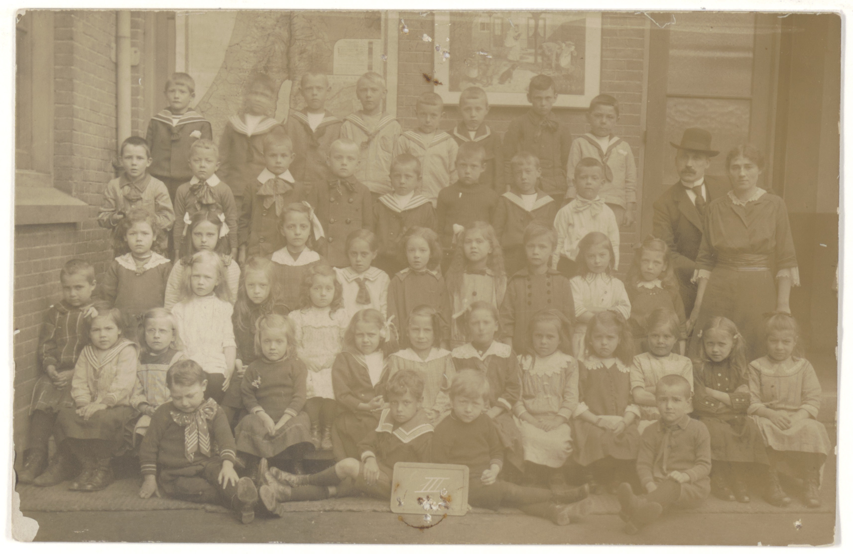 De klas III van de Geref. School voor LO en ULO aan de Vrieseweg. Rechts met hoed, het hoofd van de school H.J. Motshagen, poserend op het schoolplein.